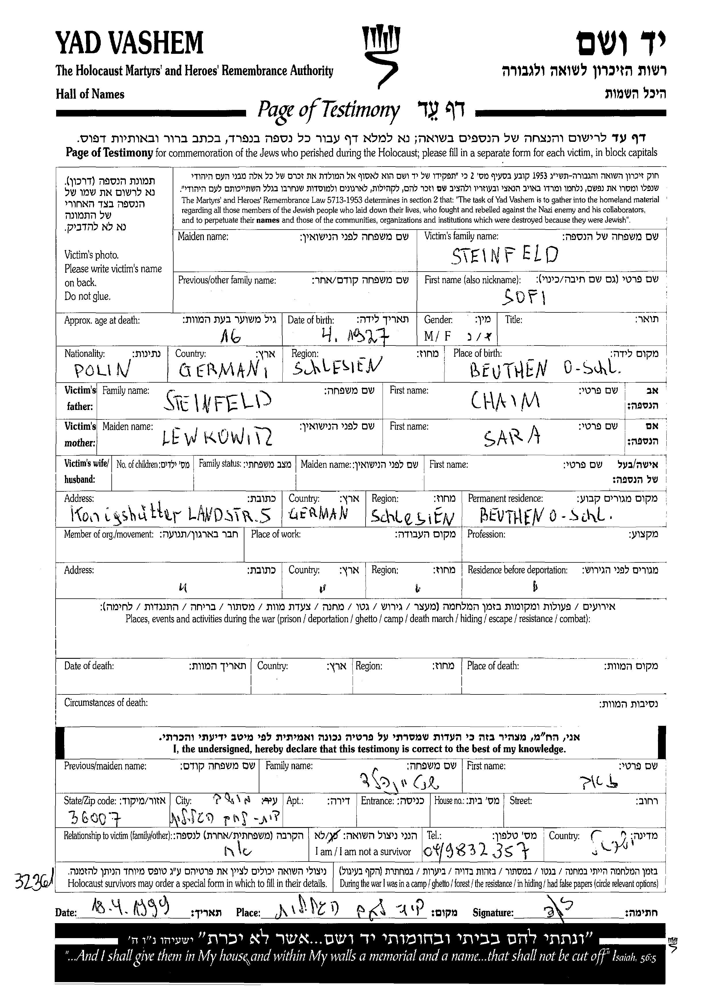 Sofi Steinfeld was born in Beuthen, Germany, 1927 to Chaim and Sara. Prior to WWII she lived in Beuthen, Germany. During the war she was in Beuthen, Germany. Sofi was murdered in the Shoah.