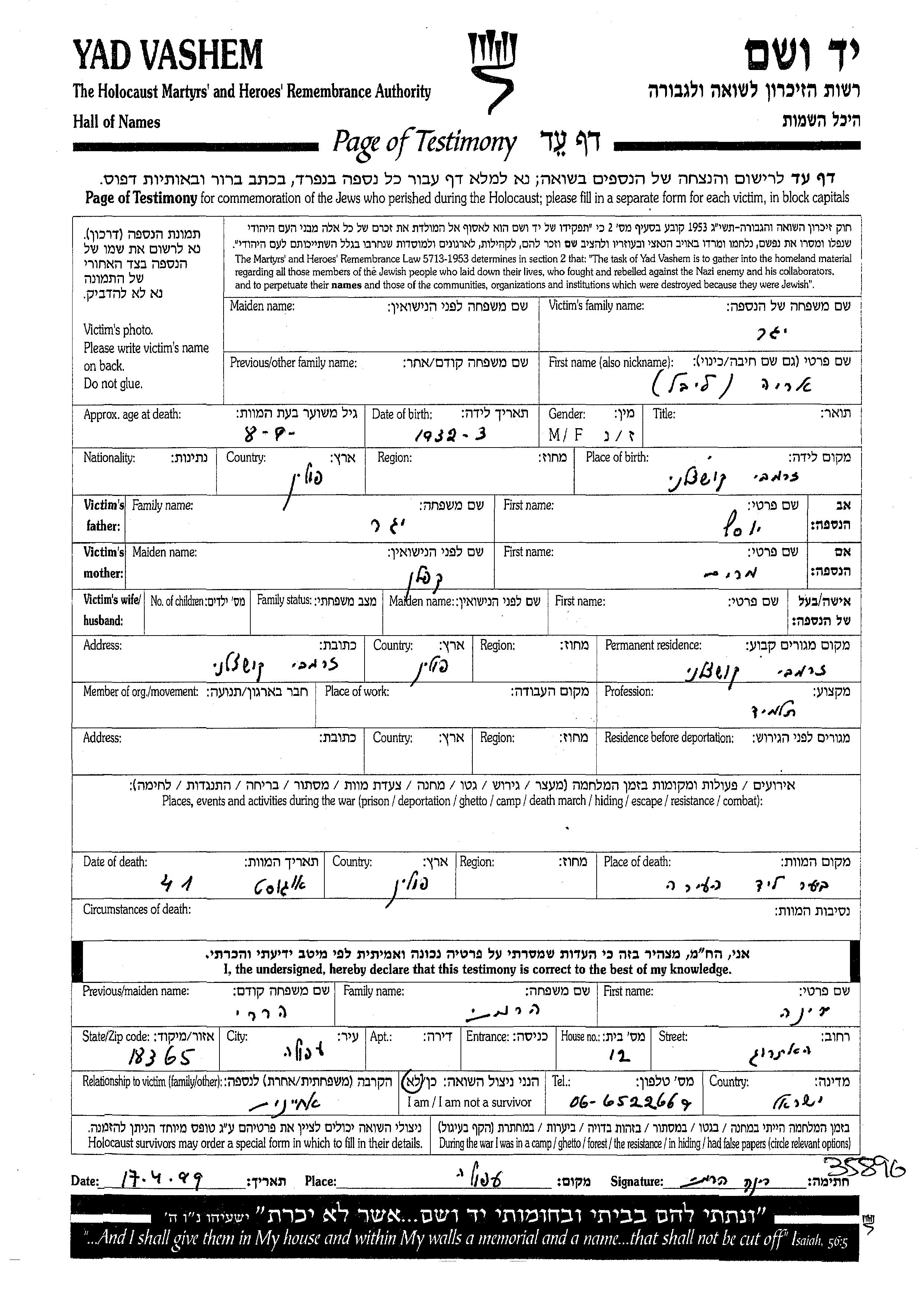 Arie Leibel Ieger was born in Zareby Koscielne, Poland, 1932 to Yosef and Miriam. He was a pupil. Prior to WWII he lived in Zareby Koscielne, Poland. Arie Leibel was murdered in the Shoah. Place of death: Zareby Koscielne, Poland, 08/1941.