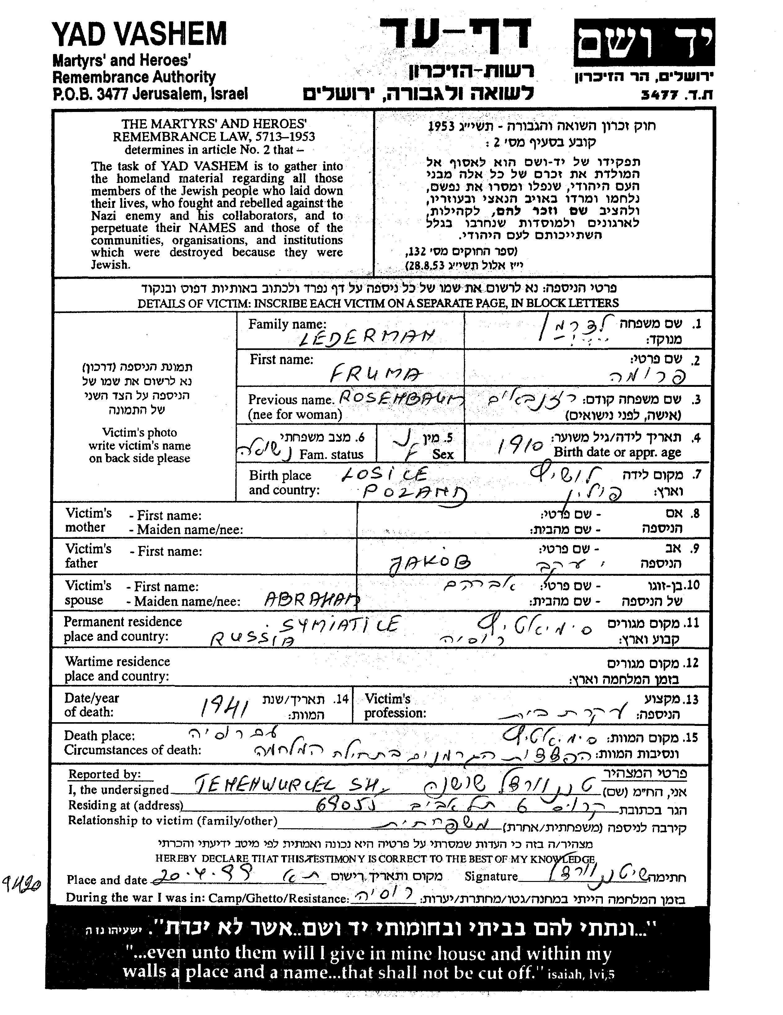 Fruma Lederman nee Rosenbaum was born in Losice, Poland, 1910 to Jakob. She was a housewife and married to Abraham. Prior to WWII she lived in Symiatycie, Poland. Fruma was murdered in the Shoah. Place of death: Symiatycie, Poland, 1941.