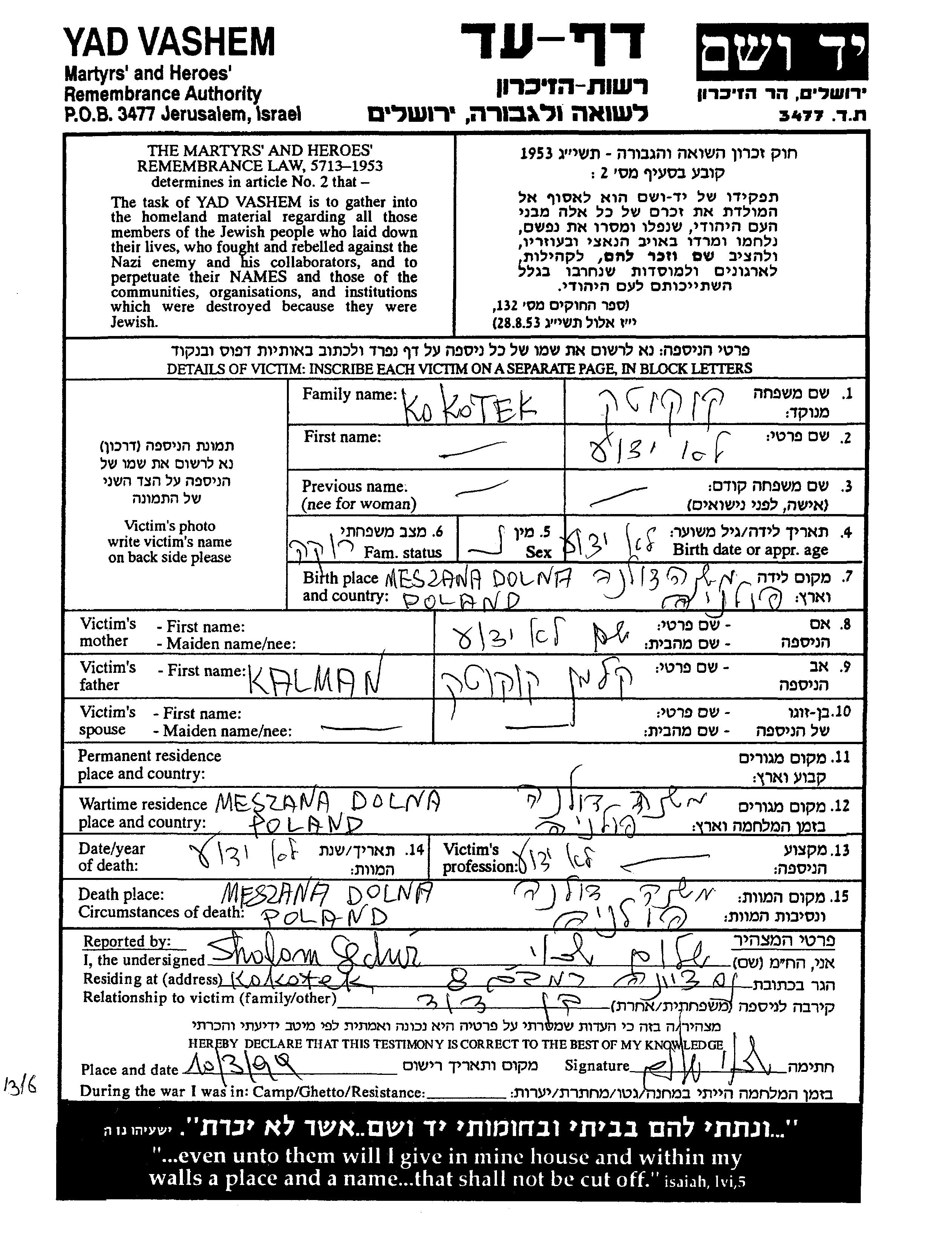 First name unknown Kokotek was born in Mszana Dolna, Poland to Kalman. She was single. During the war she was in Mszana Dolna, Poland. She was murdered in the Shoah. Place of death: Mszana Dolna, Poland.