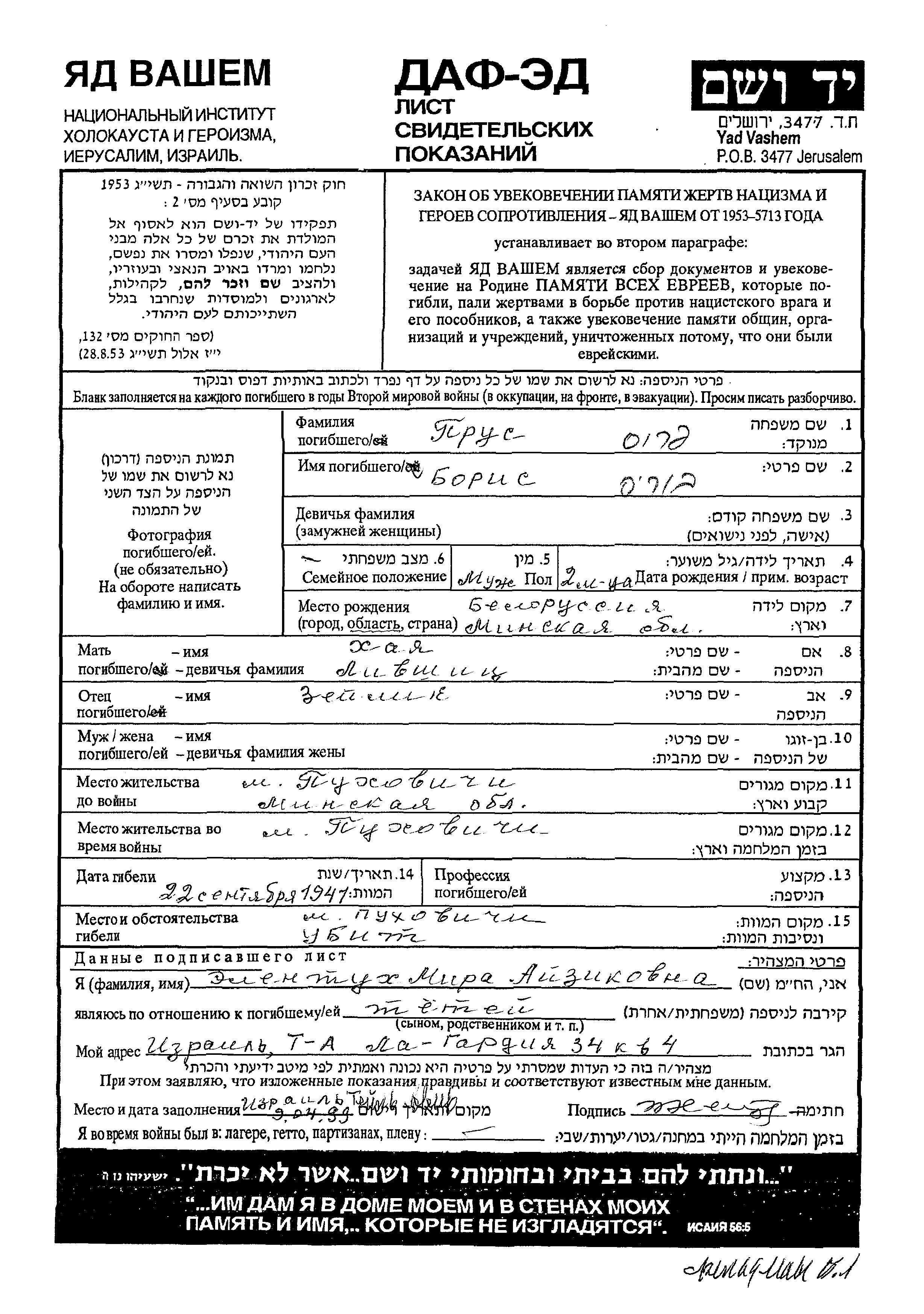 Prus Boris Pukhovichi, Belorussia (USSR) Page of Testimony