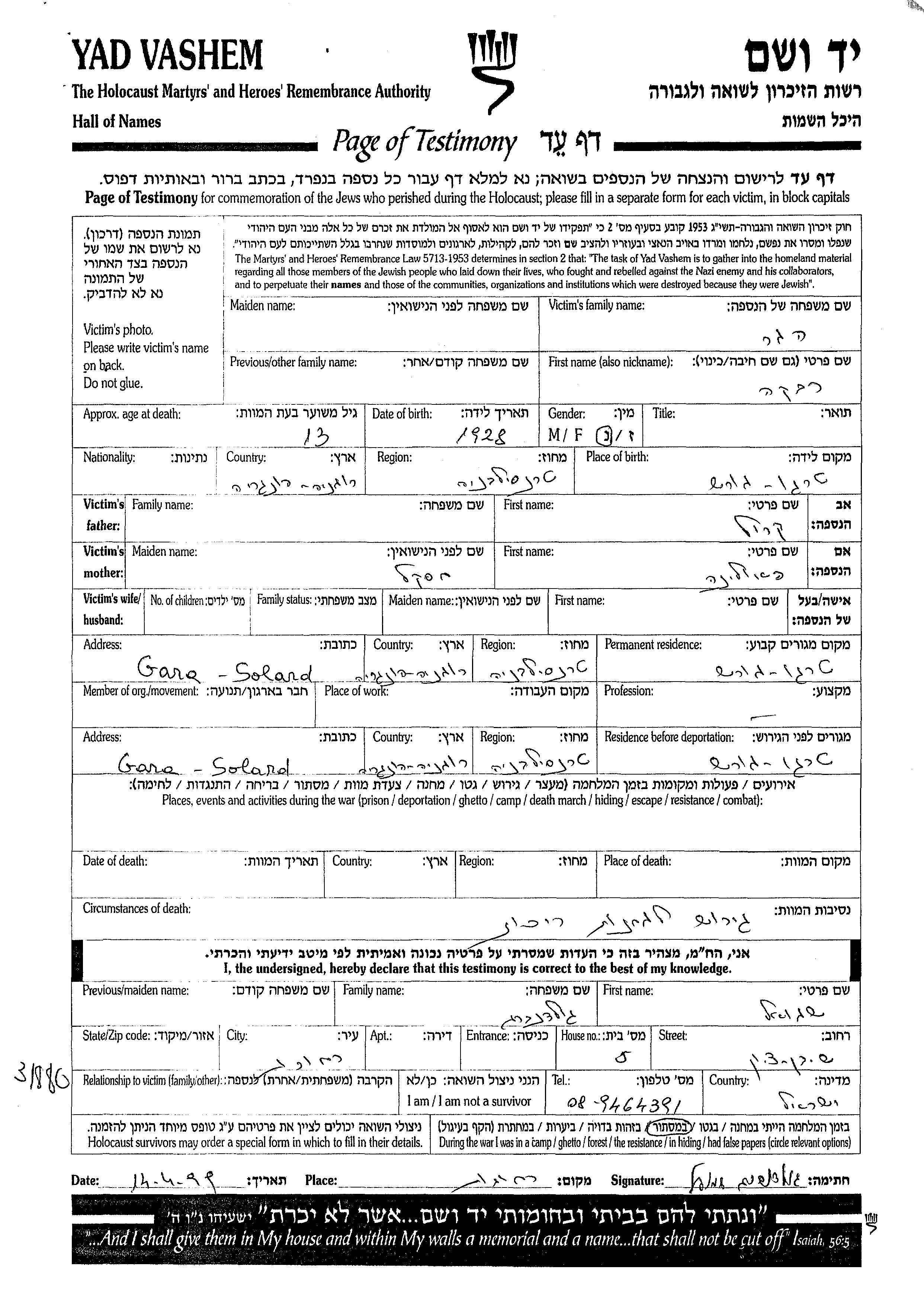 Yad Vashem - Pages of Testimony Names Memorial Collection
