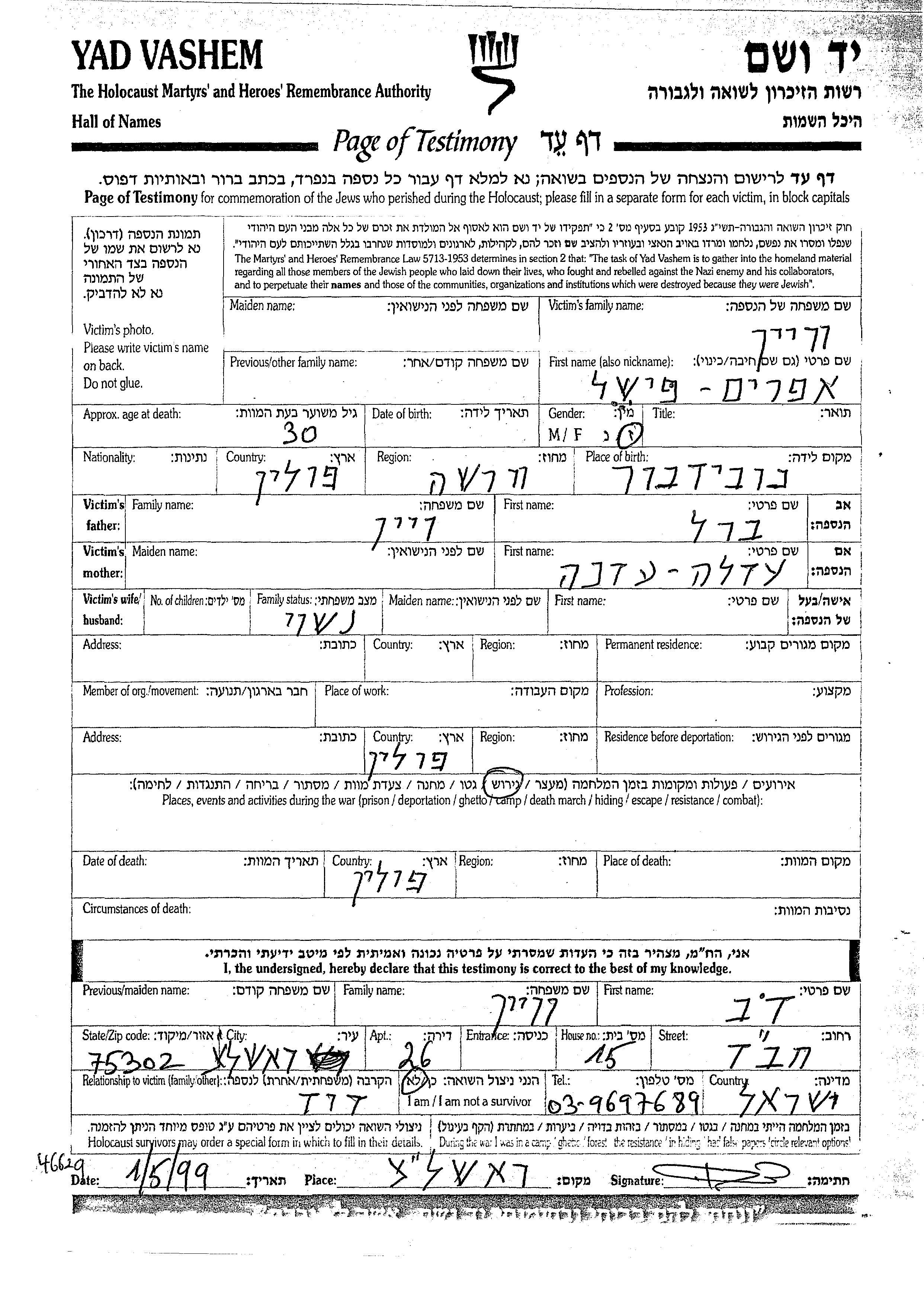 Efraim Fishel Vein was born in Nowy Dwor Mazowiecki, Poland to Berl and Adela Edna. He was married. During the war he was in Poland. Efraim Fishel was murdered in the Shoah. Place of death: Poland.