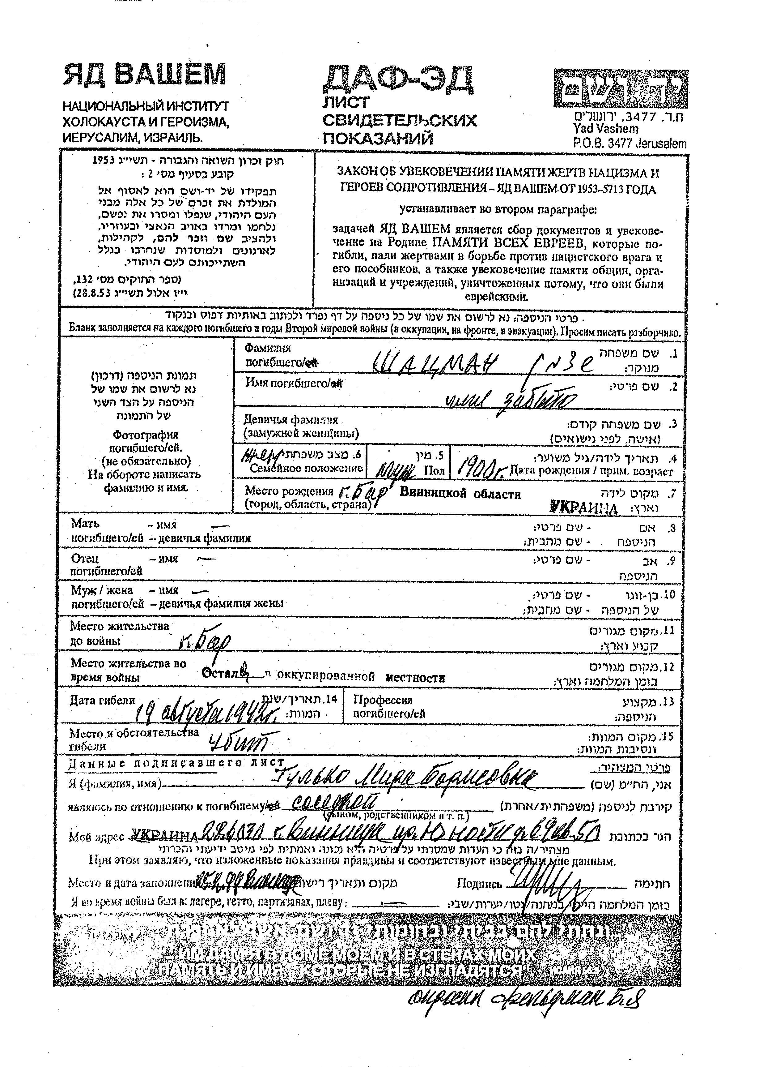 First name unknown Shatzman was born in Bar, Ukraine (USSR), 1900. She was married. Prior to WWII she lived in Bar, Ukraine (USSR). During the war she was in Bar, Ukraine (USSR). She was murdered in the Shoah. Place of death: Bar, 19/08/1942.