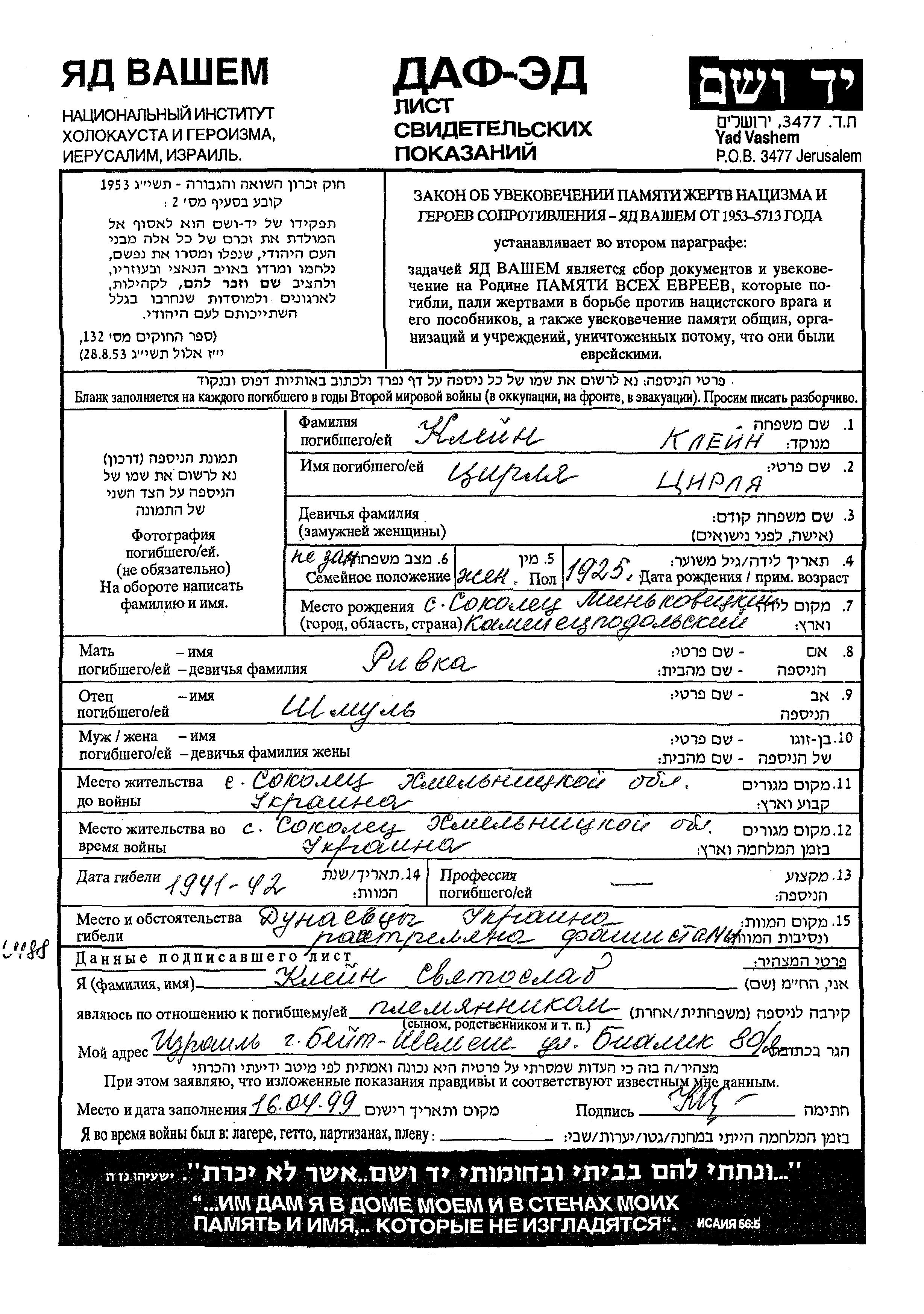 Tzirlia Klein was born in Sokolets, Ukraine (USSR), 1925 to Shmul and Rivka. She was single. Prior to WWII she lived in Sokolets, Ukraine (USSR). During the war she was in Sokolets, Ukraine (USSR). Tzirlia was murdered in the Shoah. Place of death: Dunayevtsy, Ukraine (USSR), 1941.