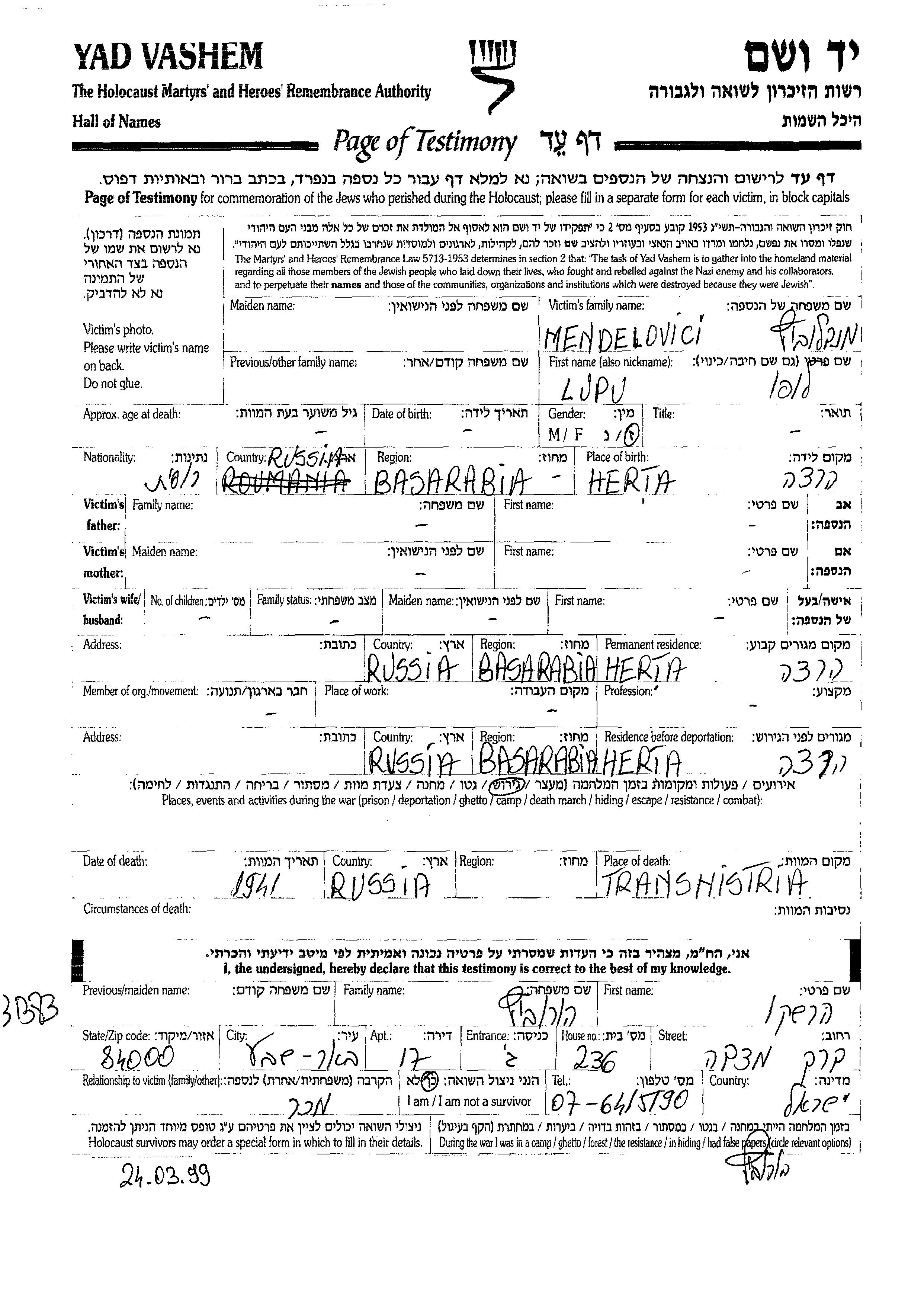 Mendelovici Lupu Herta, Romania Page of Testimony