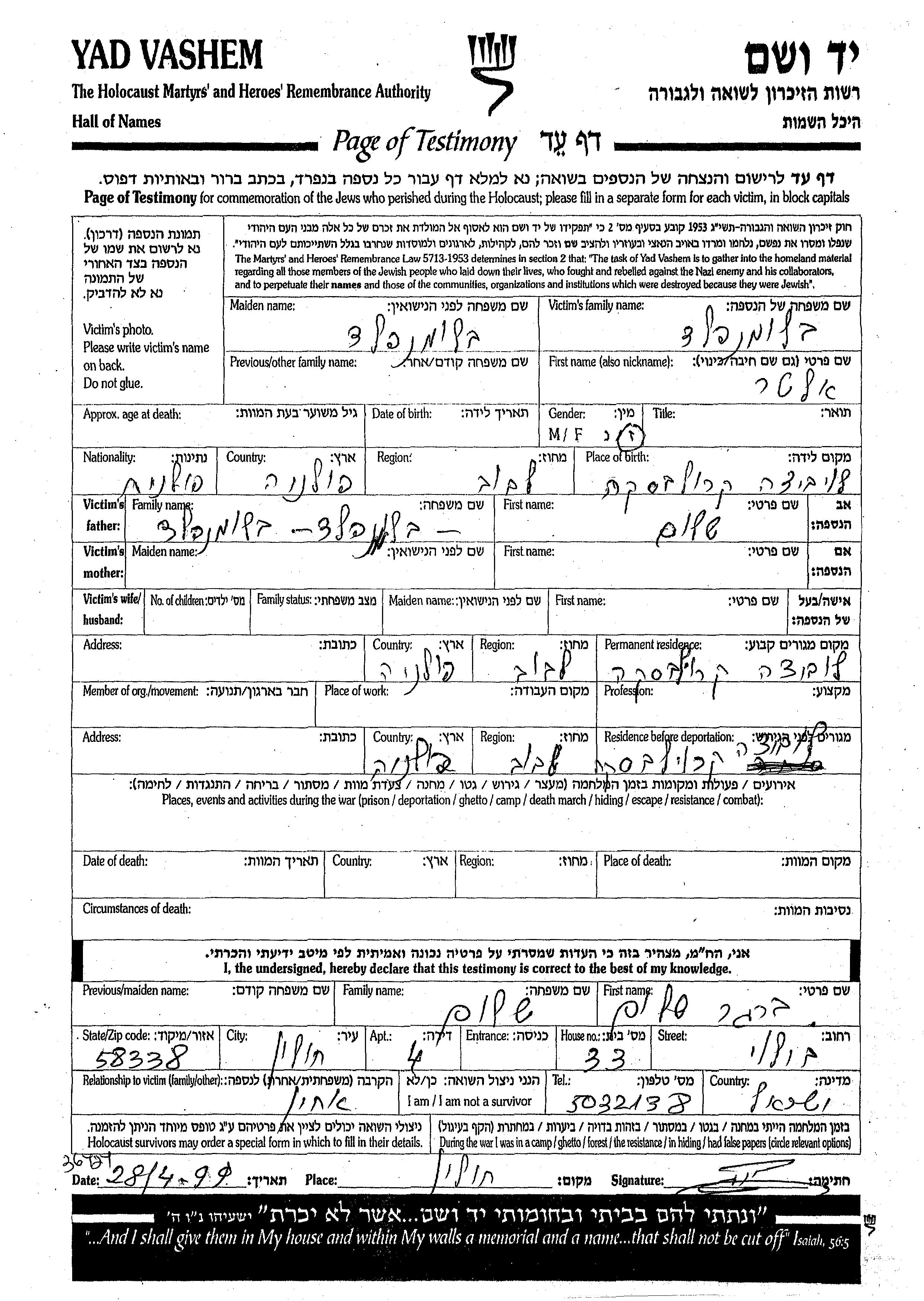 Alter Blumenfeld was born in Lubycza Krolewska, Poland to Shalom. Prior to WWII he lived in Lubycza Krolewska, Poland. During the war he was in Lubycza Krolewska, Poland. Alter was murdered in the Shoah.