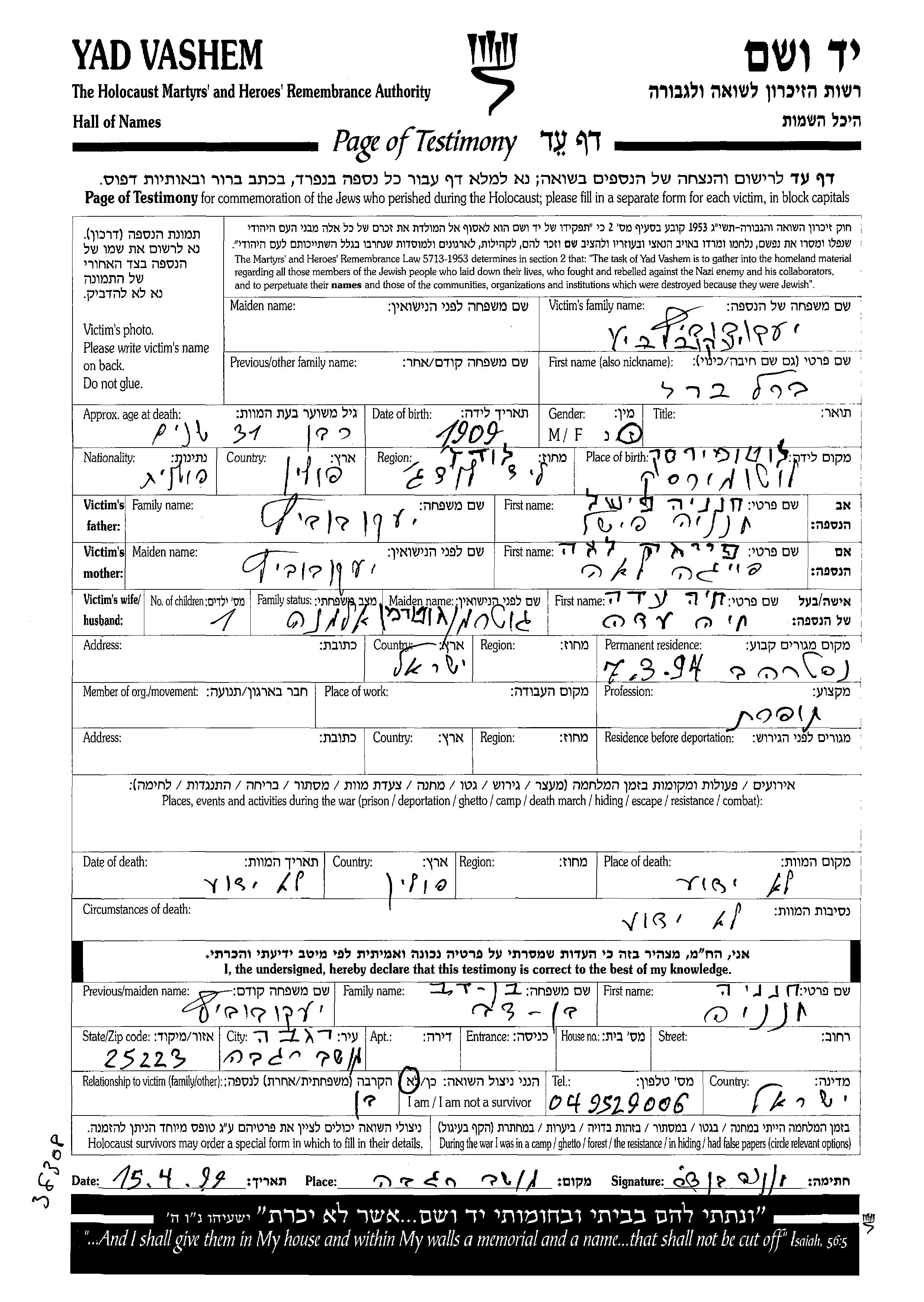 Berl Yakubovitz was born in Lutomiersk, Poland, 1909 to Khanania Fishel and Feiga Lea. He was married to Khaia Ada nee Guterman. Prior to WWII he lived in Lutomiersk, Poland. Berl was murdered in the Shoah. Place of death: Poland.