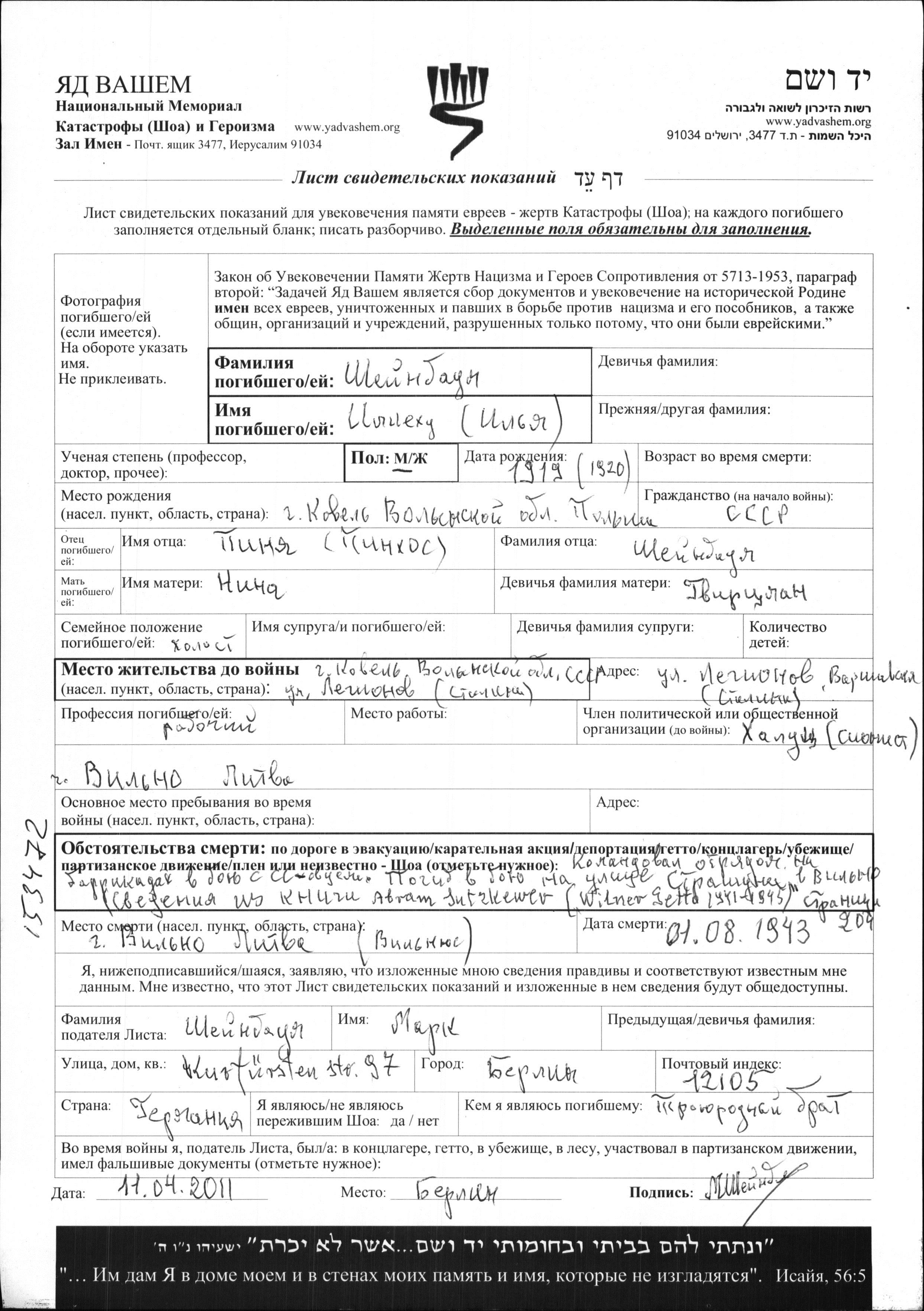 Sheynbaum Iliyekhu 1919 Kovel, Poland Page of Testimony