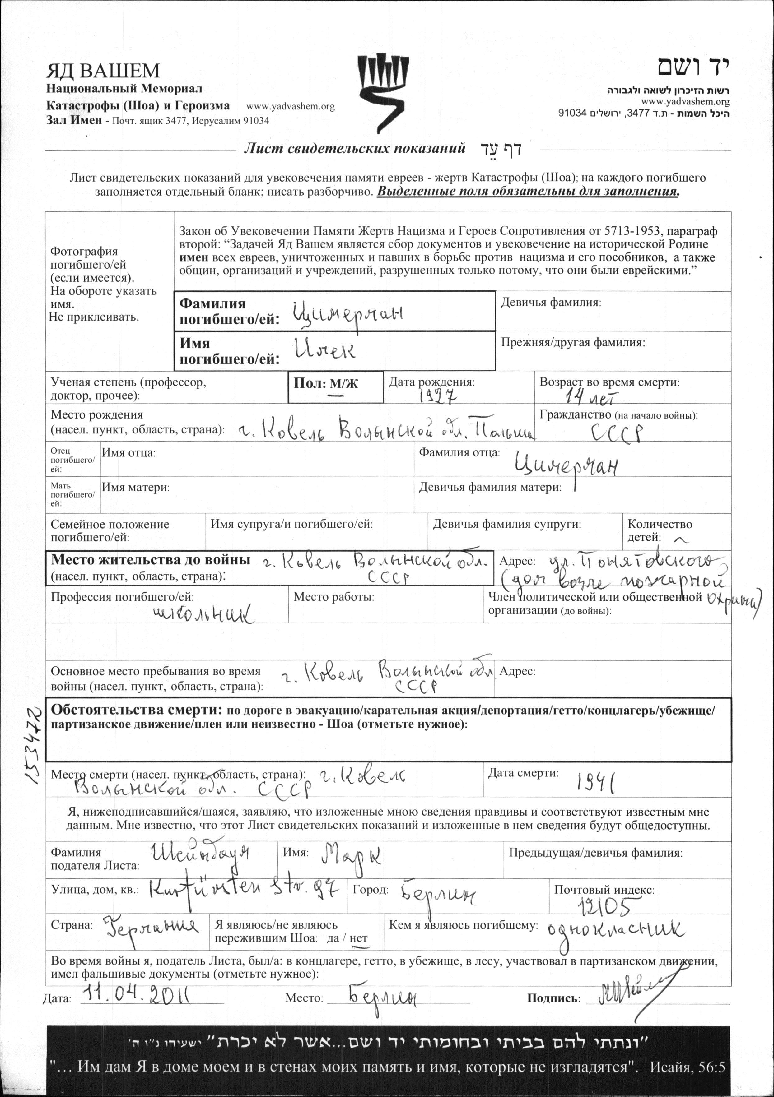 Tzimerman Ilek 1927 Kovel, Poland Page of Testimony