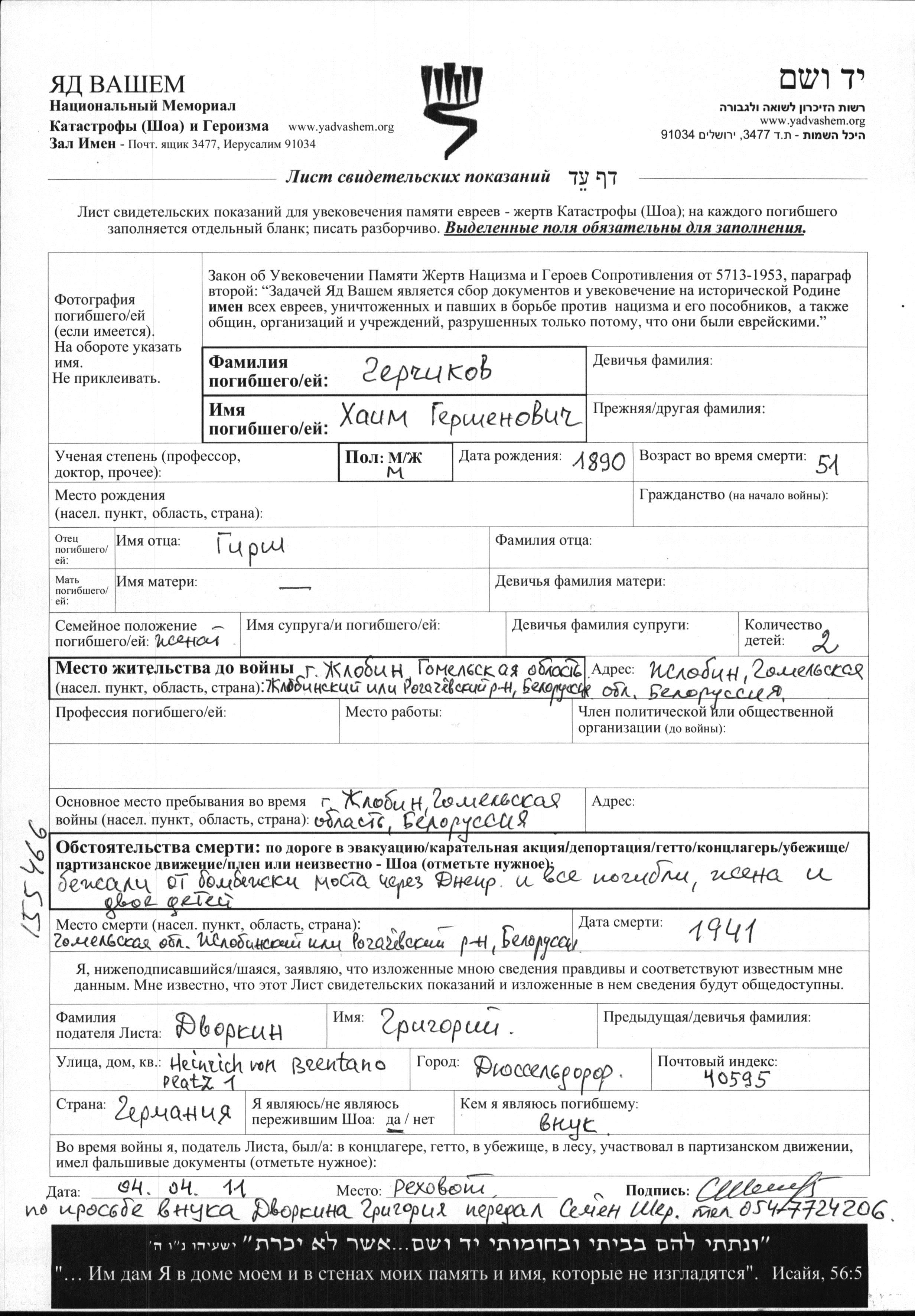 Khaim Gerchikov was born, 1890 to Girsh. He was married. Prior to WWII he lived in Zhlobin, Belorussia (USSR). During the war he was in Zhlobin, Belorussia (USSR). Khaim was murdered in the Shoah. Place of death: Zhlobin, Belorussia (USSR), 1941.
