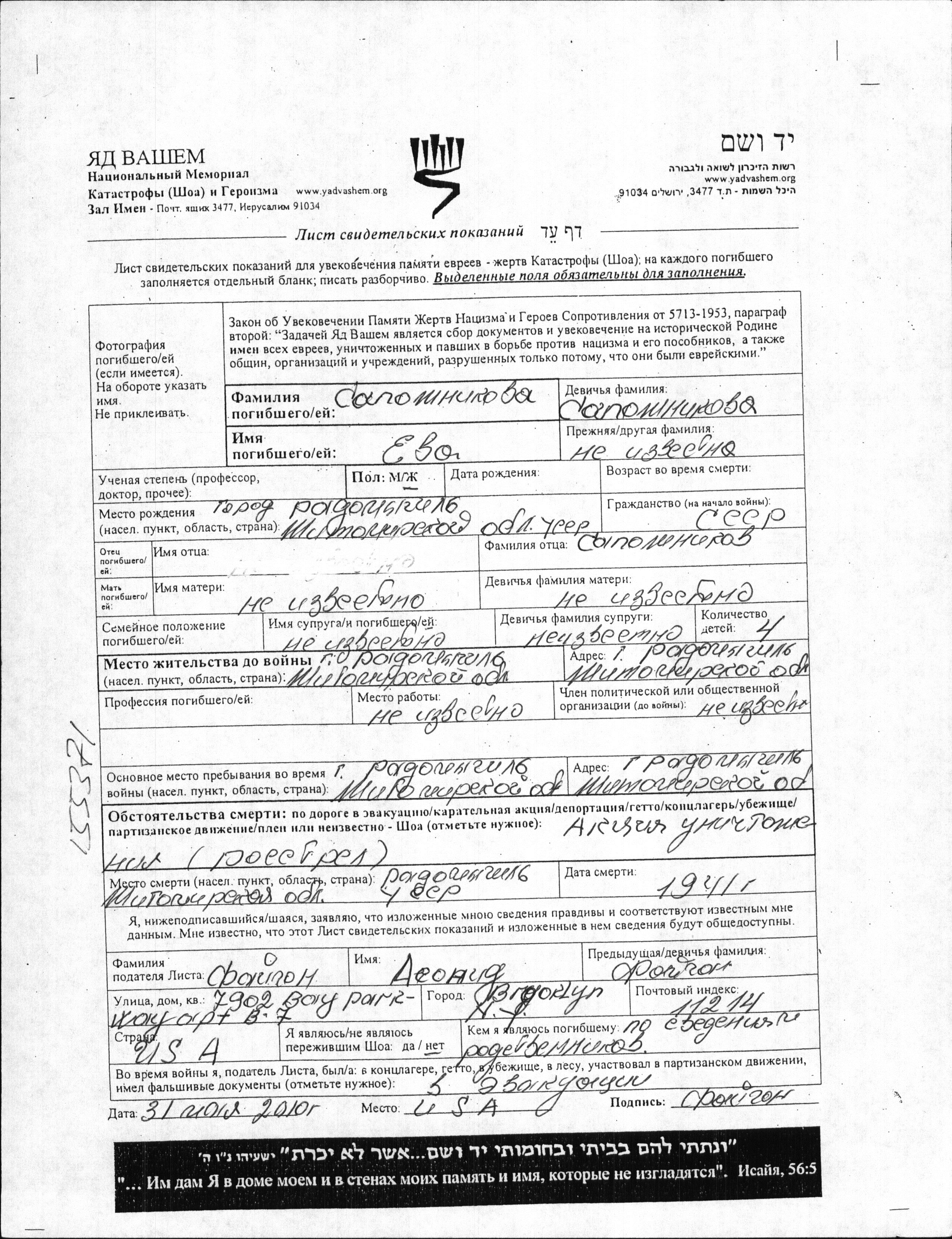 Sapozhnikova Yeva Radomyshl, Ukraine (USSR) Page of Testimony