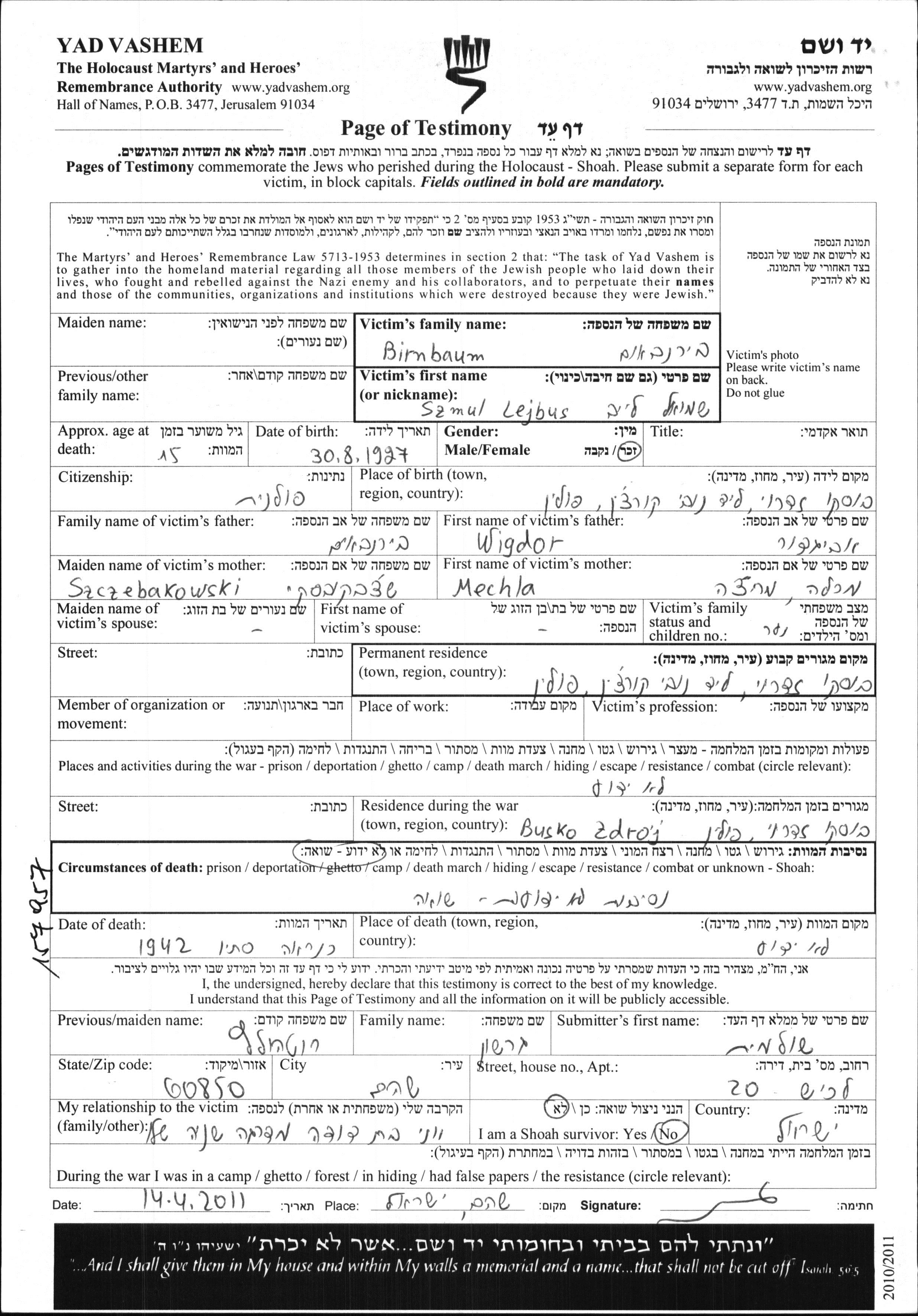 Birnbaum Szmul Lejbus 1927 Busko Zdroj, Poland Page of Testimony