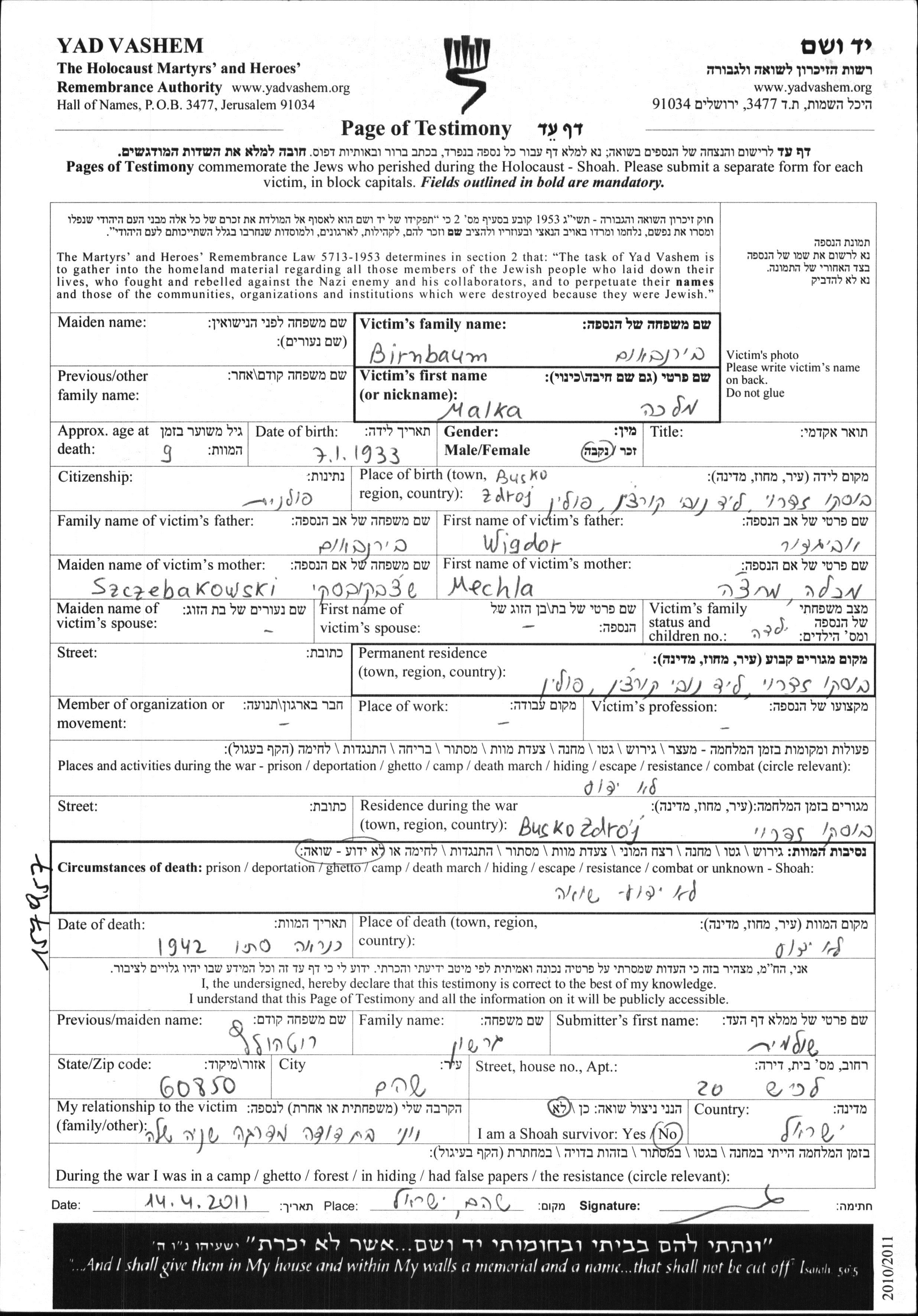 Birnbaum Malka 1933 Busko Zdroj, Poland Page of Testimony