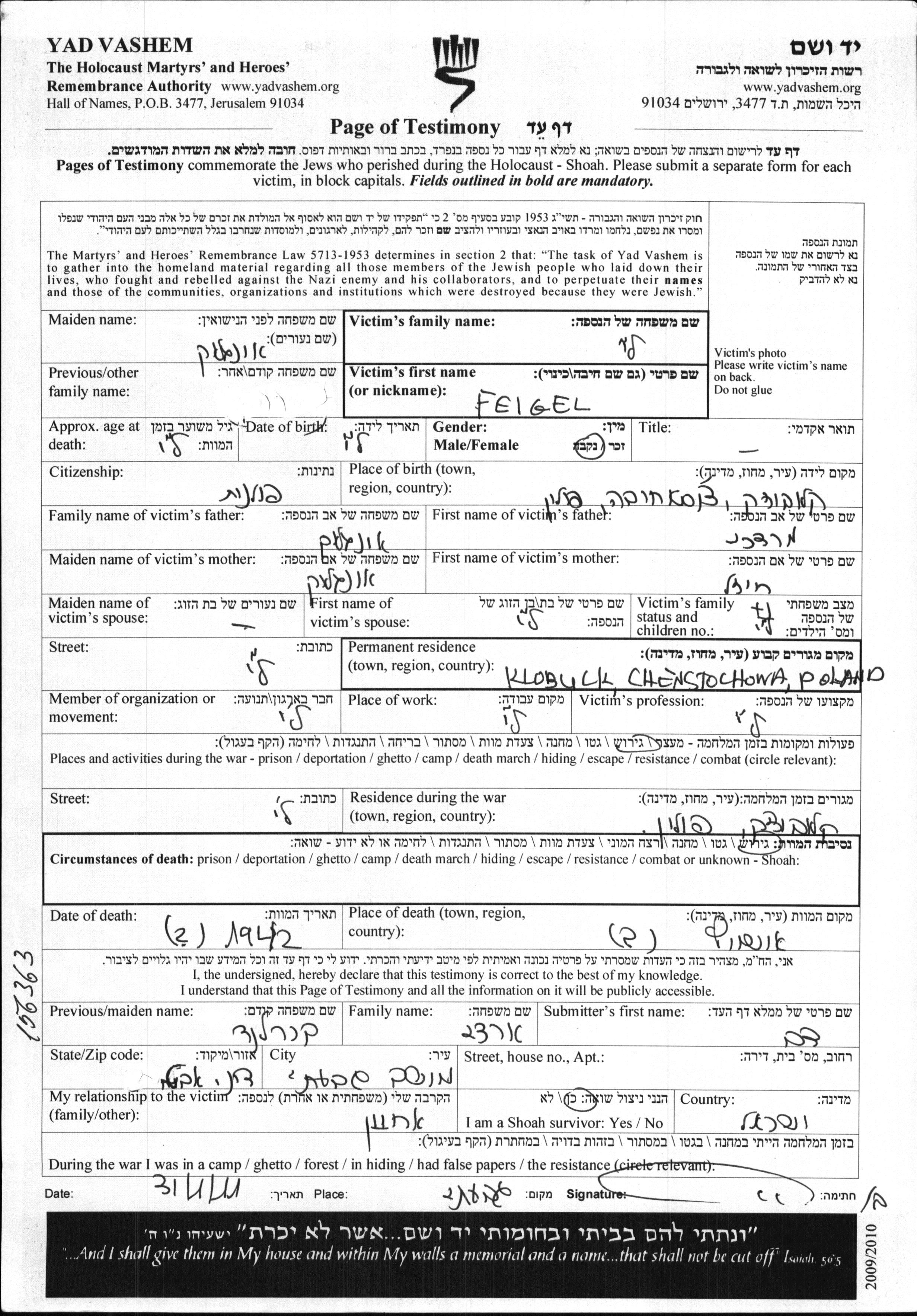 Feigel Levi nee Unglik was born in Klobuck, Poland to Mordekhai and Reizl. She was married. Prior to WWII she lived in Klobuck, Poland. During the war she was in Klobuck, Poland. Feigel was murdered in the Shoah. Place of death: Auschwitz, Poland, 1942.