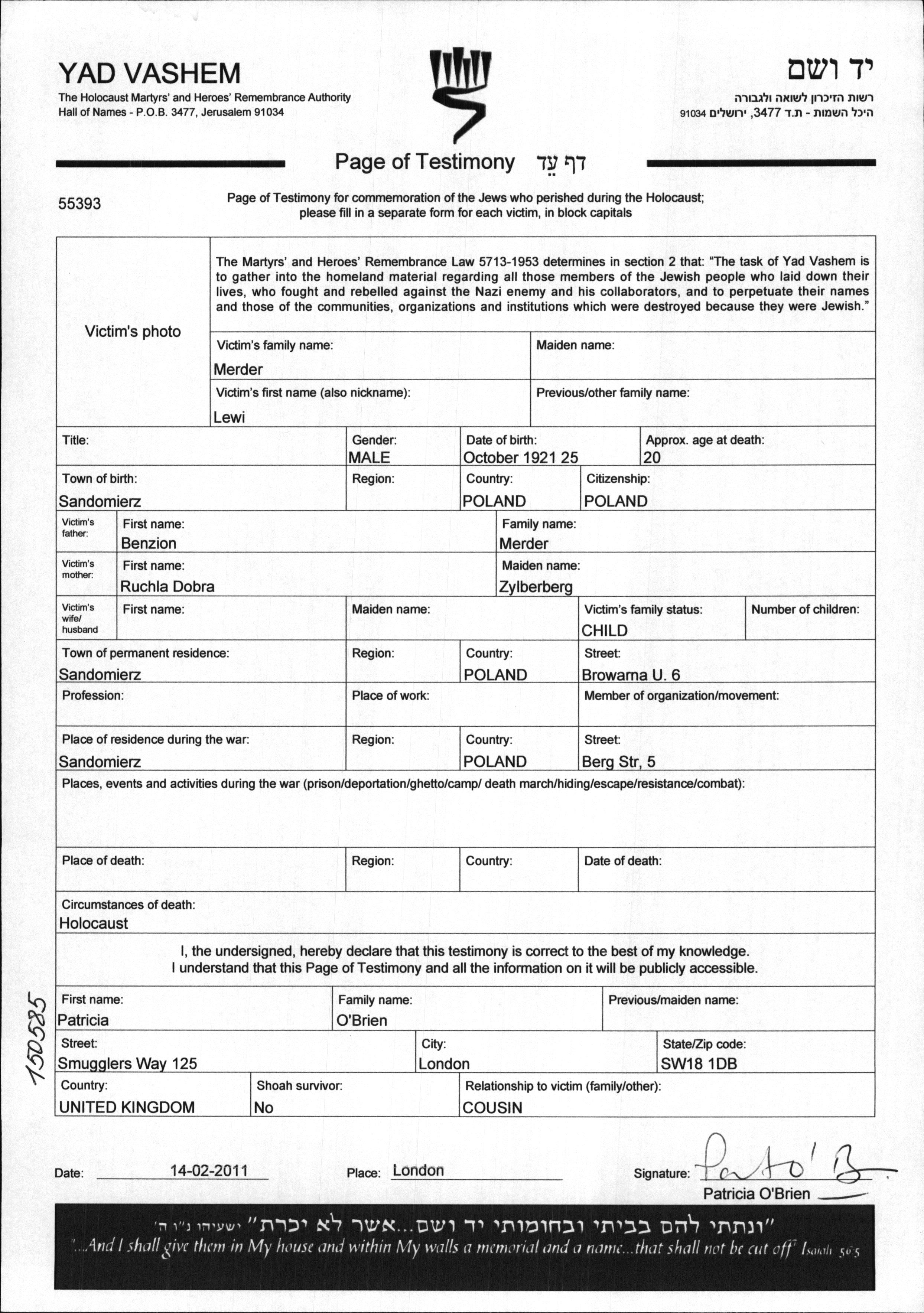 Lewi Merder was born in Sandomierz, Poland, 1921 to Benzion and Ruchla Dobra nee Zylberberg. Prior to WWII he lived in Sandomierz, Poland. During the war he was in Sandomierz, Poland. Lewi was murdered in the Shoah.