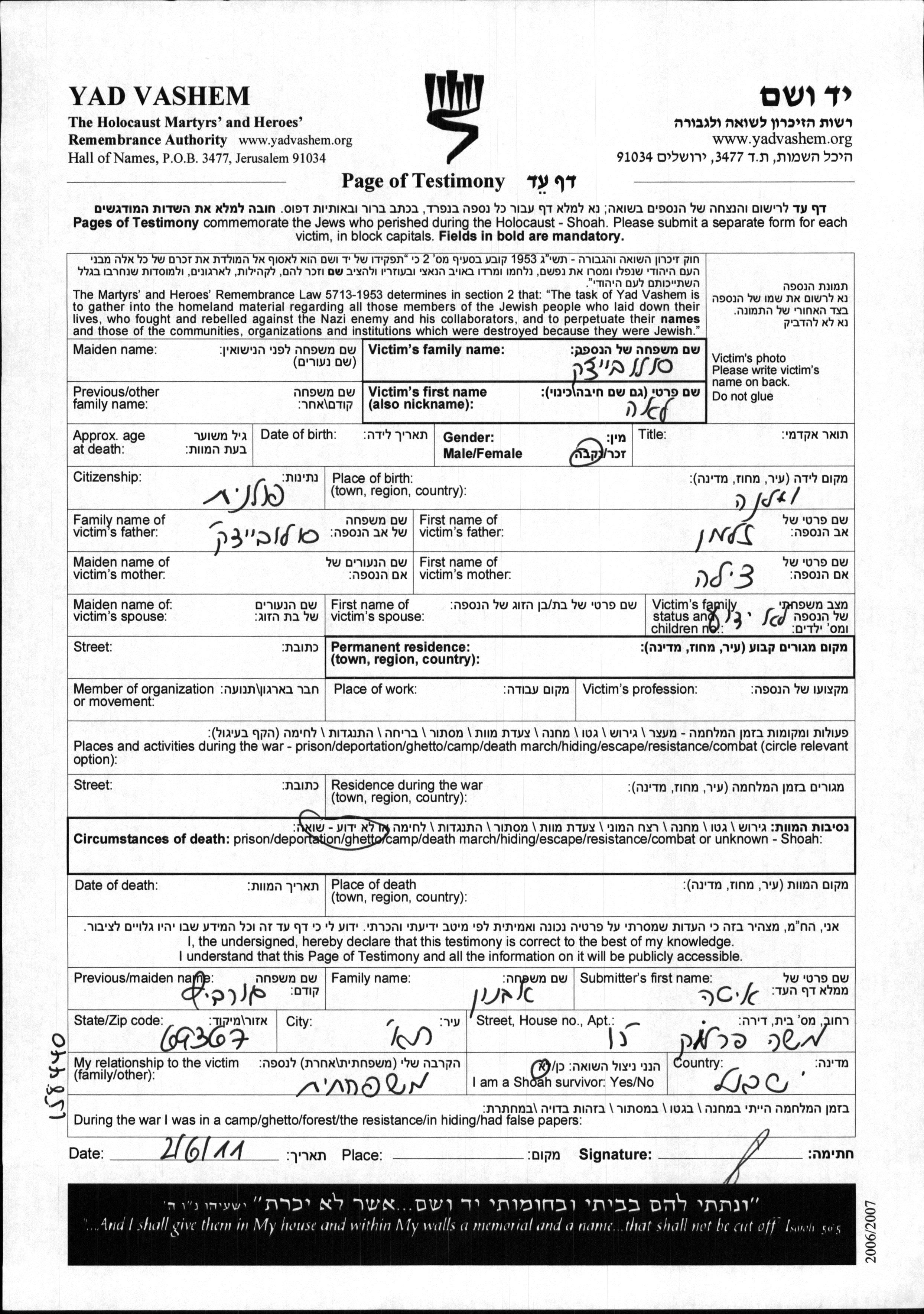 Yad Vashem - Pages of Testimony Names Memorial Collection