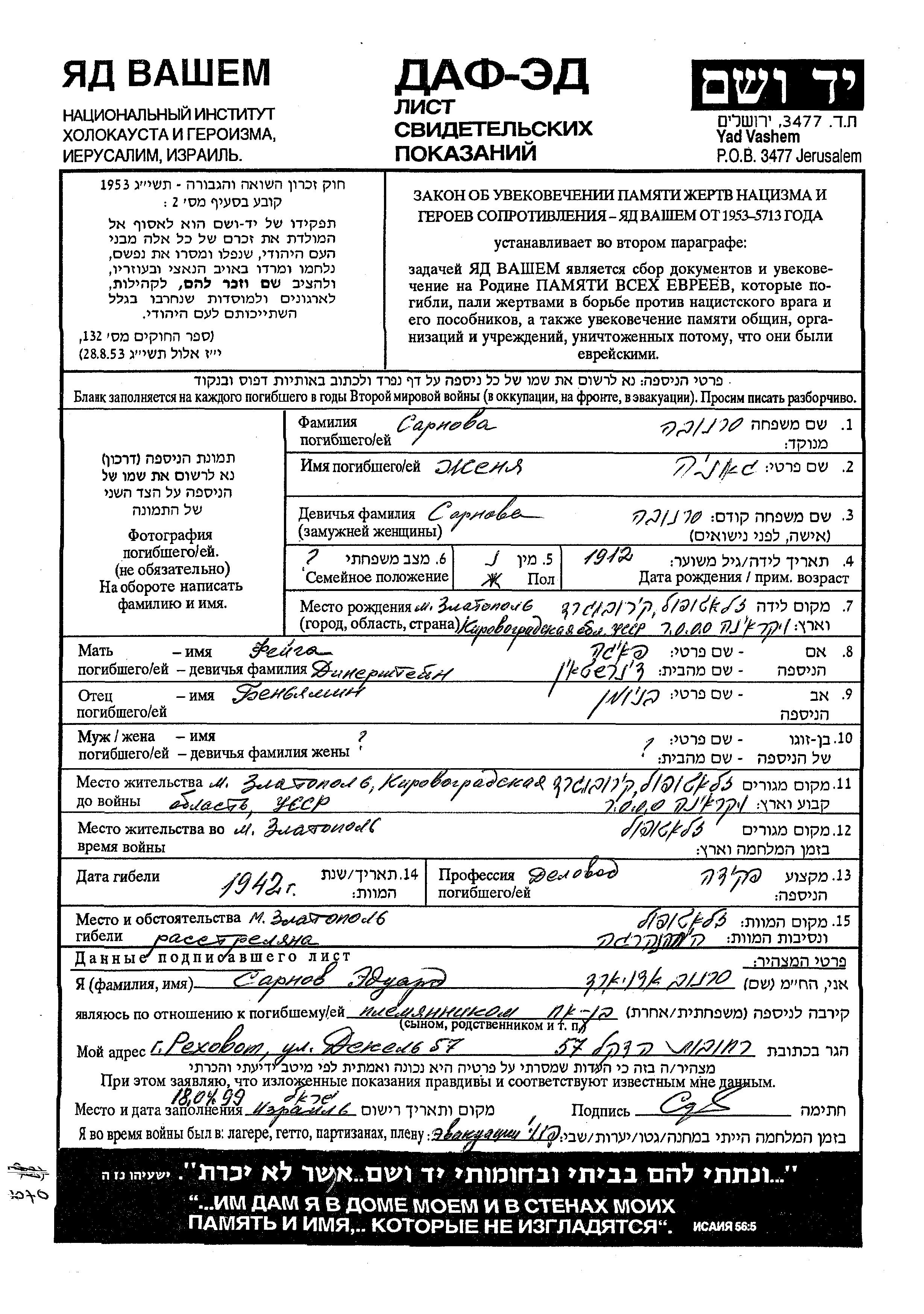 Sarnova Zhenya Genya 1912 Zlatopol, Ukraine (USSR) Page of Testimony