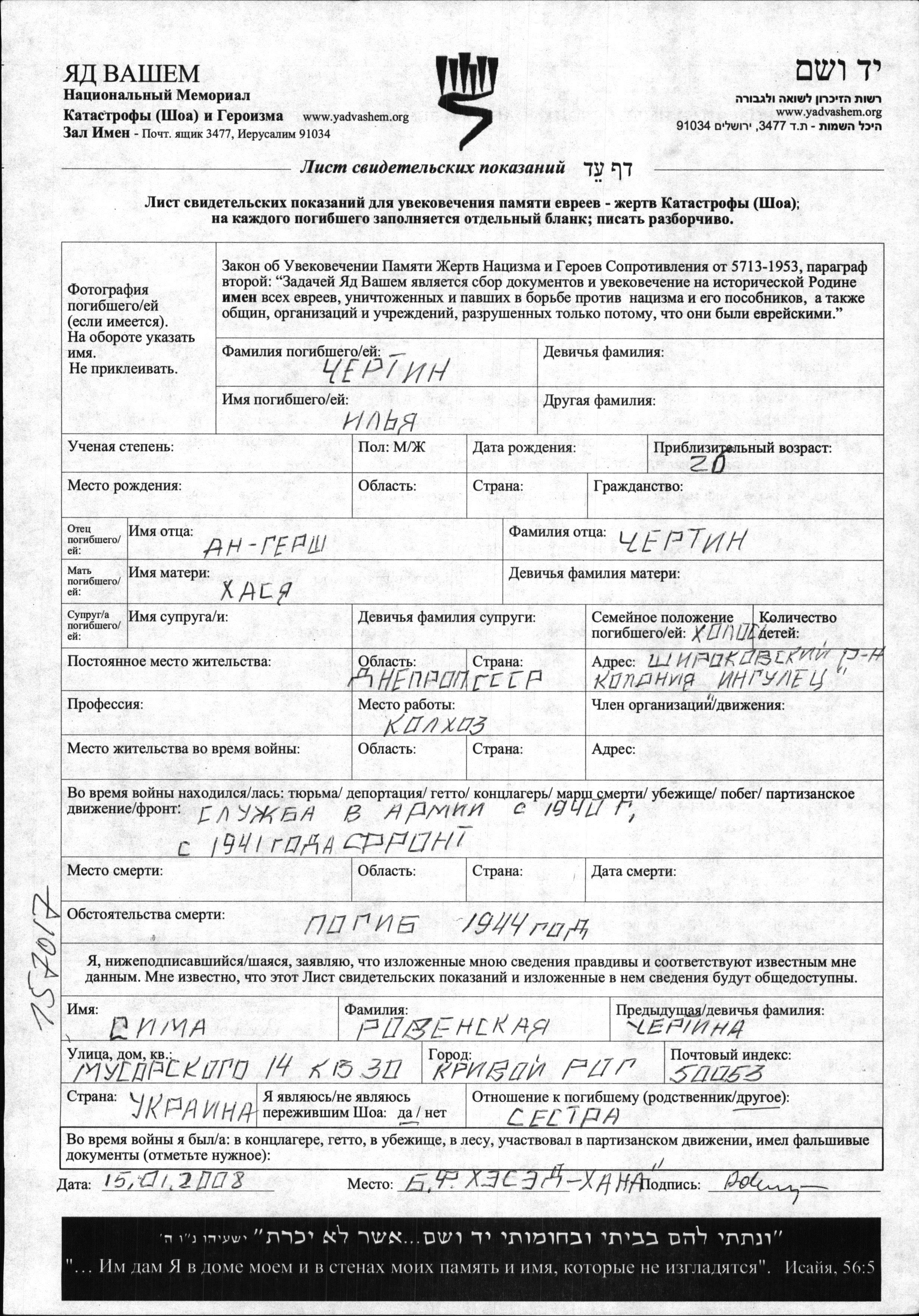 Ilya Chertin was born to An Gersh and Khasya. He was single. Prior to WWII he lived in Ingulets, Ukraine (USSR). During the war he was in the Soviet armed forces. Ilya was killed in military service in WWII. Place of death: unknown, 1944.