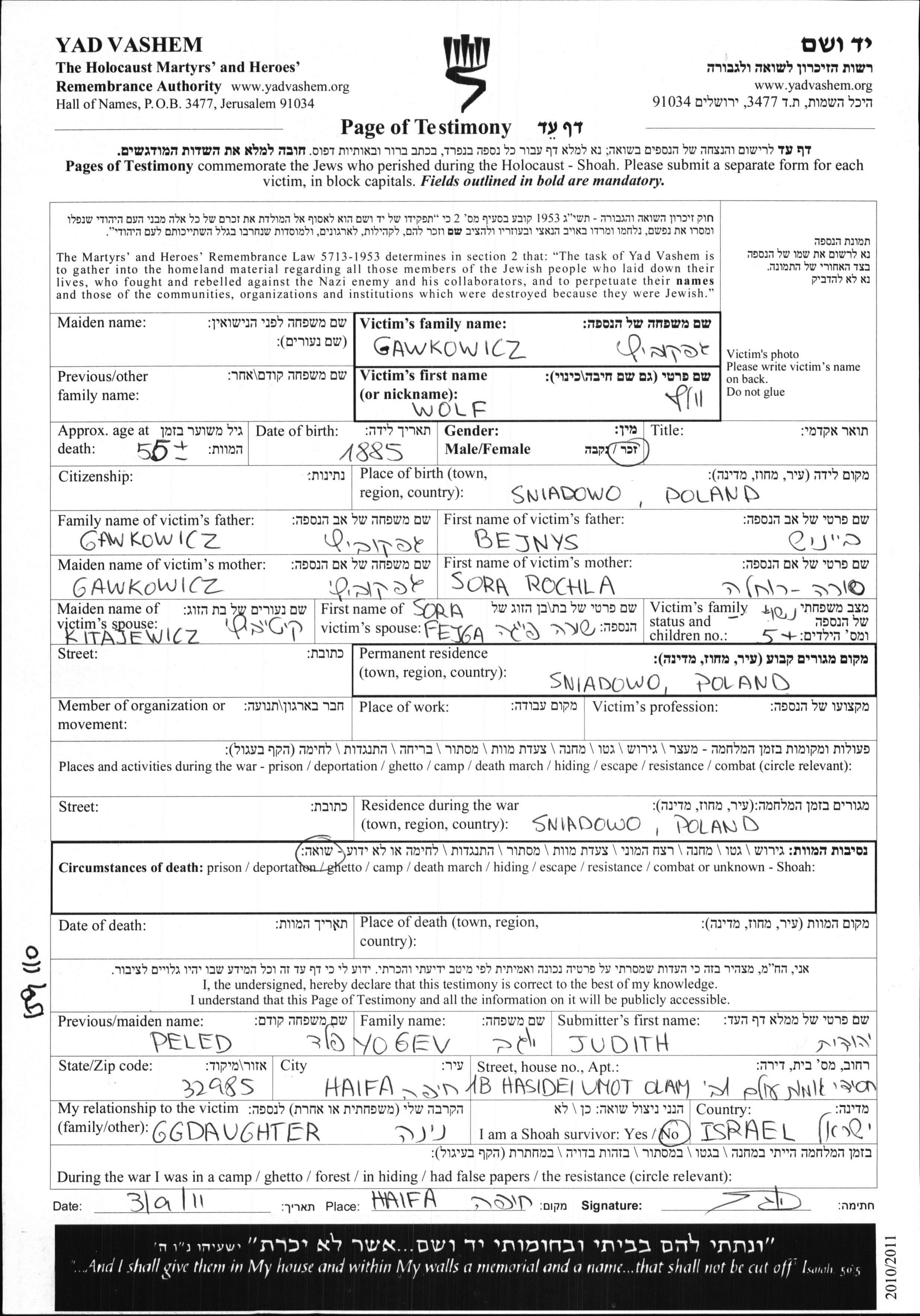 Wolf Gawkowicz was born in Sniadowo, Poland, 1885 to Bejnys and Sora Rochla. He was married to Sora Fejga nee Kitajewicz. Prior to WWII he lived in Sniadowo, Poland. During the war he was in Sniadowo, Poland. Wolf was murdered in the Shoah.