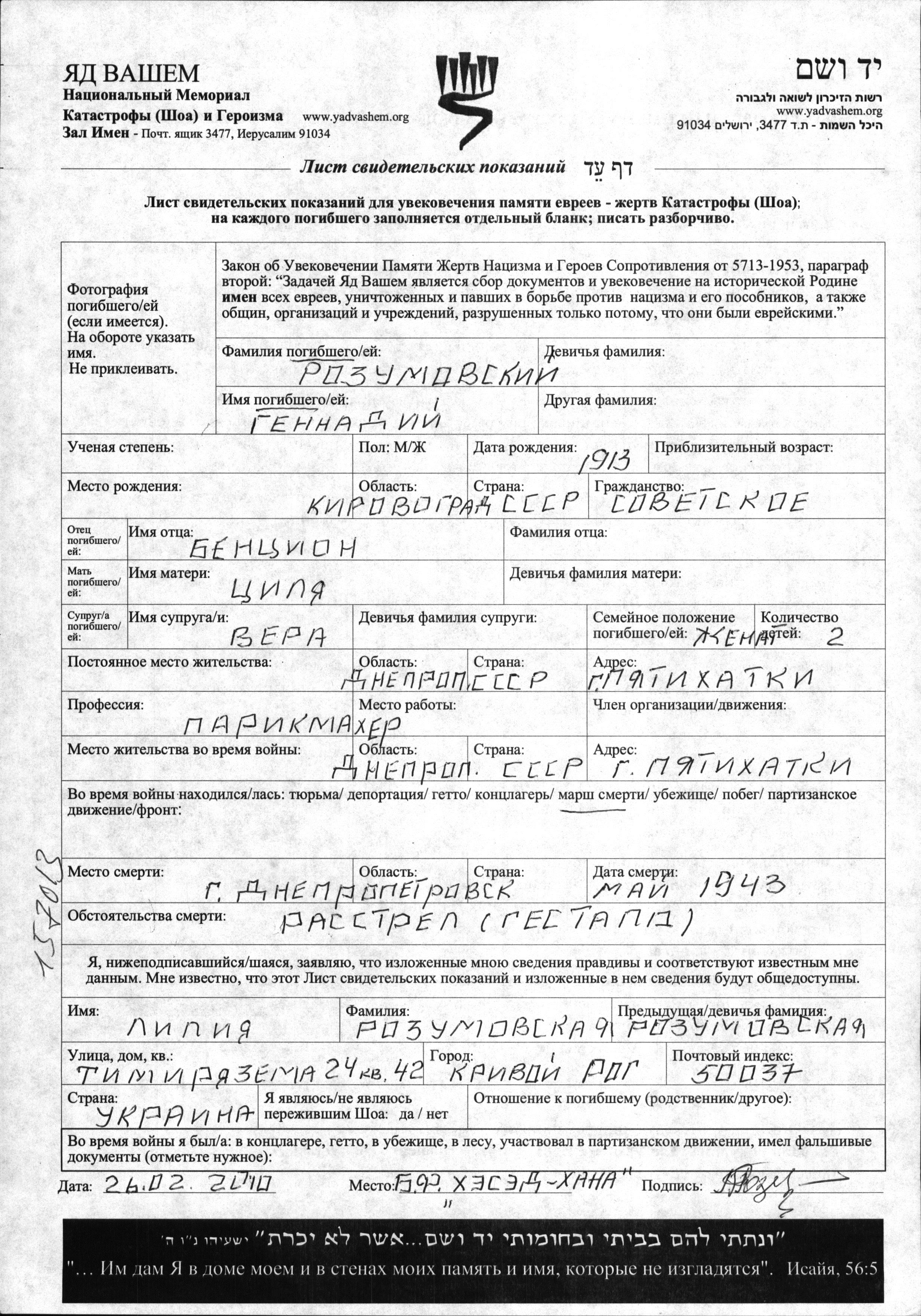 Gennadi Rozumovski was born in Kirovograd, Ukraine (USSR), 1913 to Bentzion and Tzilya. He was a hairdresser and married to Vera. Prior to WWII he lived in Pyatikhatki, Ukraine (USSR). During the war he was in Pyatikhatki, Ukraine (USSR). Gennadi was murdered in the Shoah. Place of death: Dnepropetrovsk, Ukraine (USSR), 05/1943.