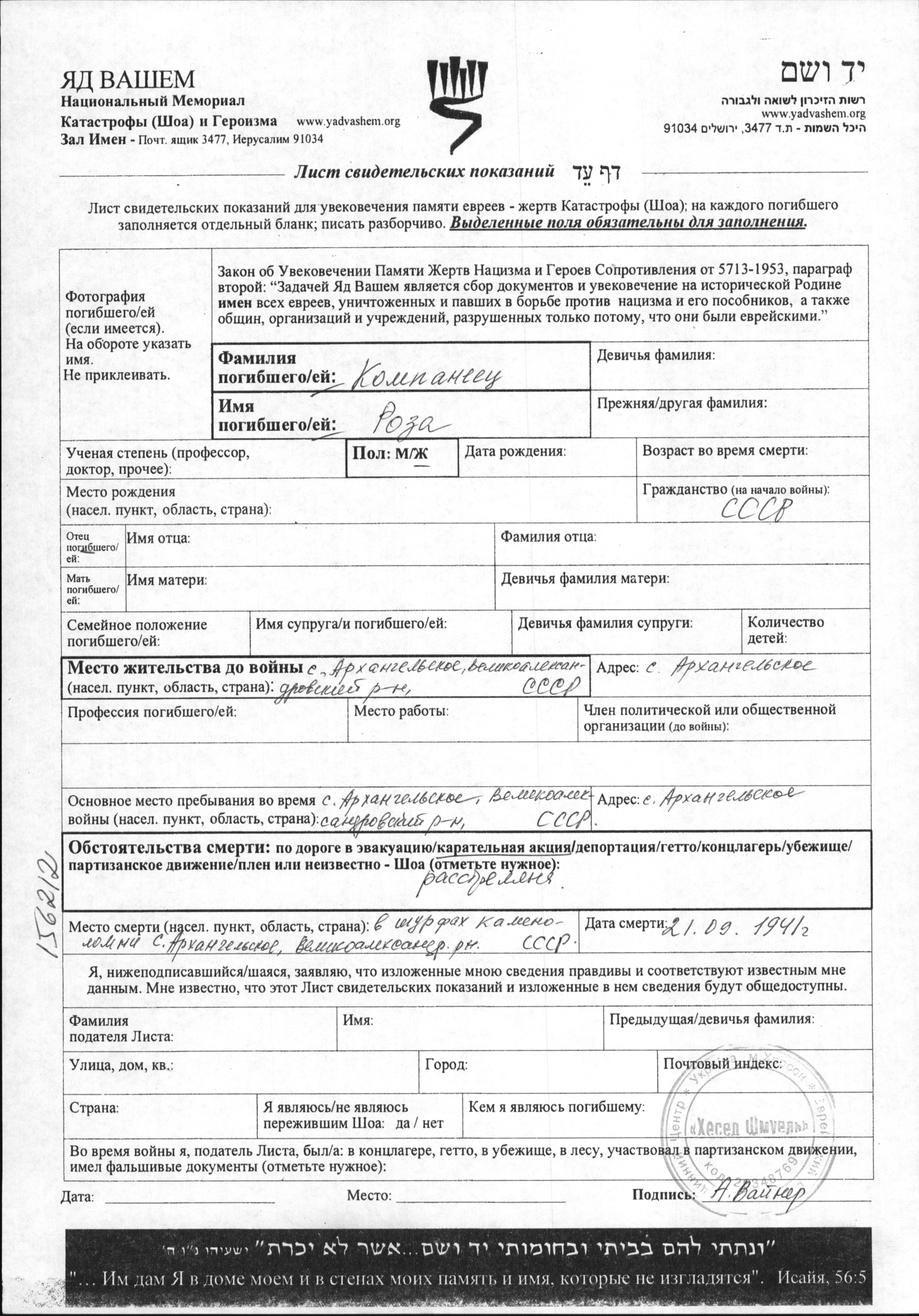 Kompaneyetz Roza Arkhangelskoye, Ukraine (USSR) Page of Testimony