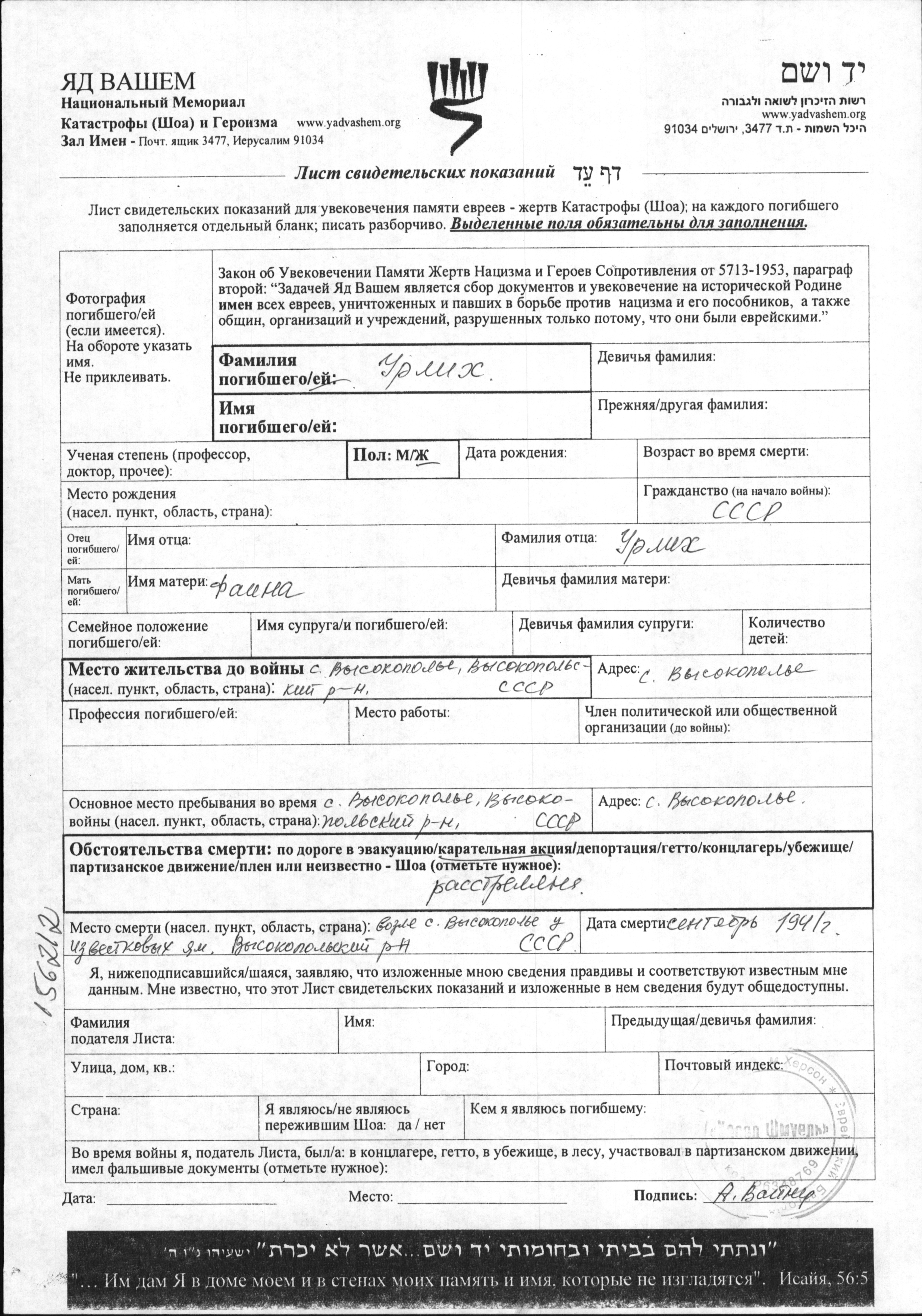 First name unknown Urlikh was born to Faina. Prior to WWII she lived in Vysokopolye, Ukraine (USSR). During the war she was in Vysokopolye, Ukraine (USSR). She was murdered in the Shoah. Place of death: Vysokopolye, Ukraine (USSR), 09/1941.
