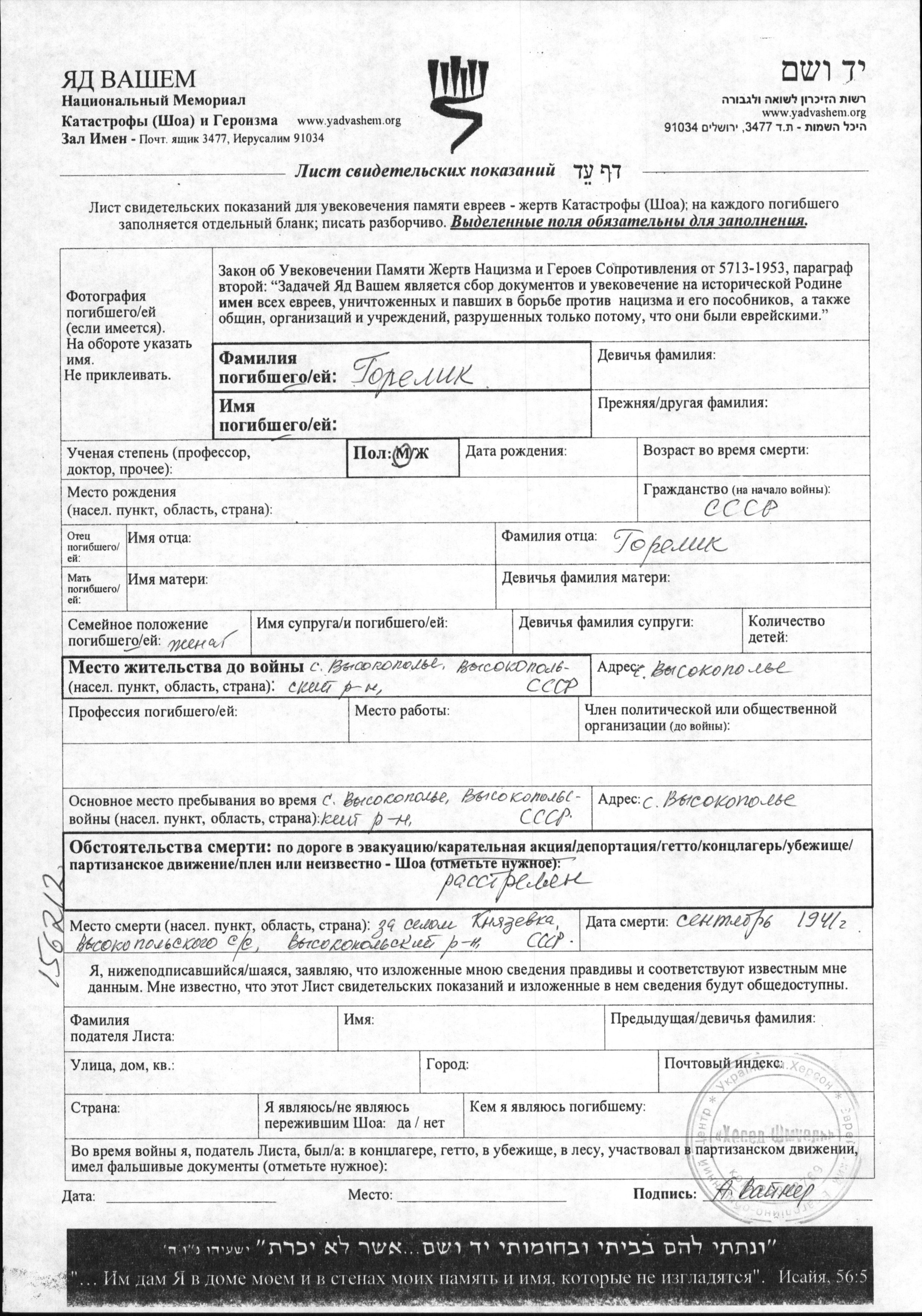 First name unknown Gorelik. He was married. Prior to WWII he lived in Vysokopolye, Ukraine (USSR). During the war he was in Vysokopolye, Ukraine (USSR). He was murdered in the Shoah. Place of death: Knyazevka Area, Ukraine (USSR), 09/1941.