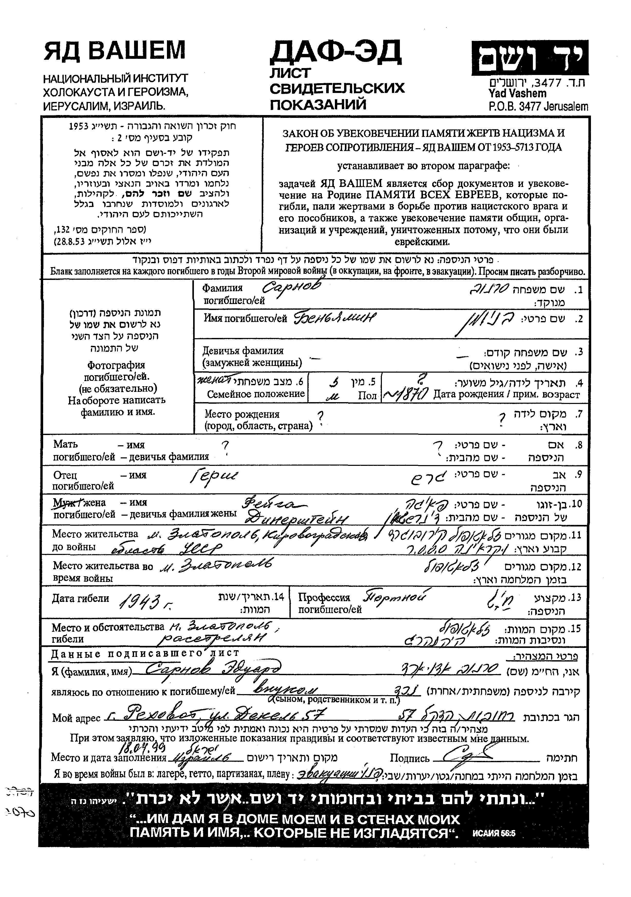 Sarnov Beniamin 1870 Zlatopol, Ukraine (USSR) Page of Testimony