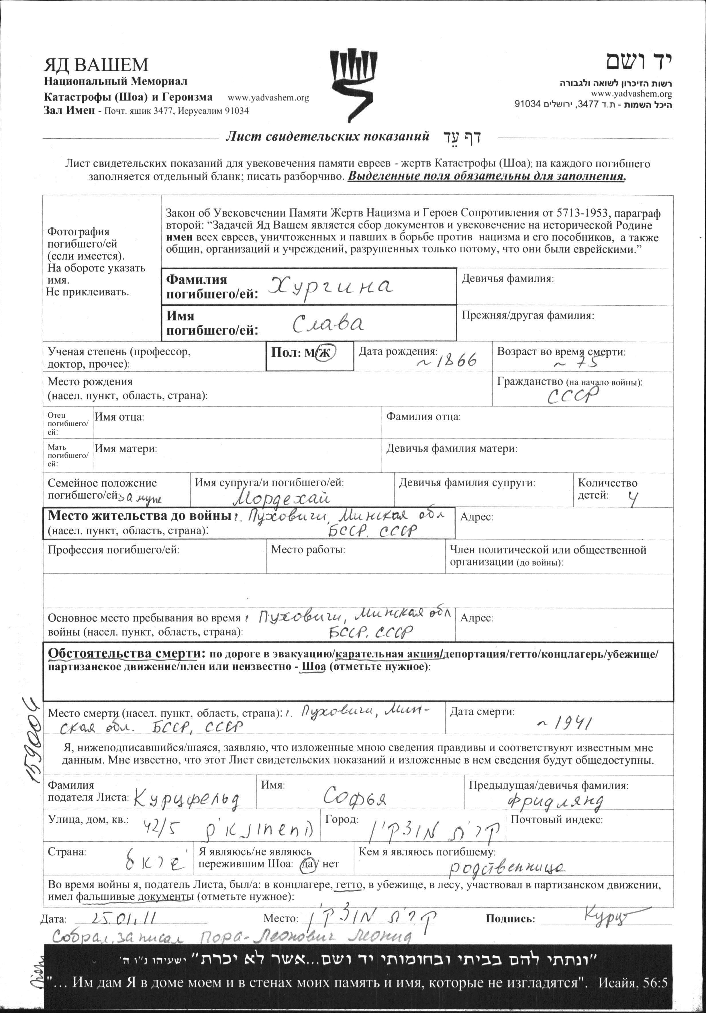 Khurgina Slava 1866 Pukhovichi, Belorussia (USSR) Page of Testimony