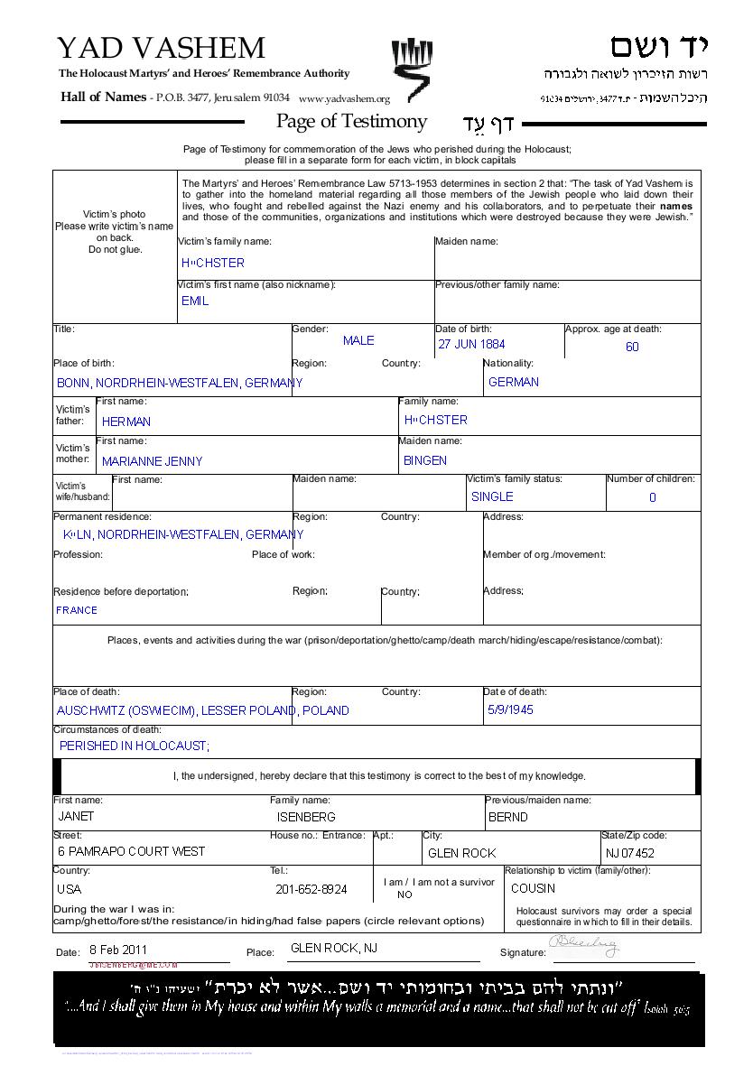 Hoechster Emil 1884 Koeln, Germany Page of Testimony (digital)
