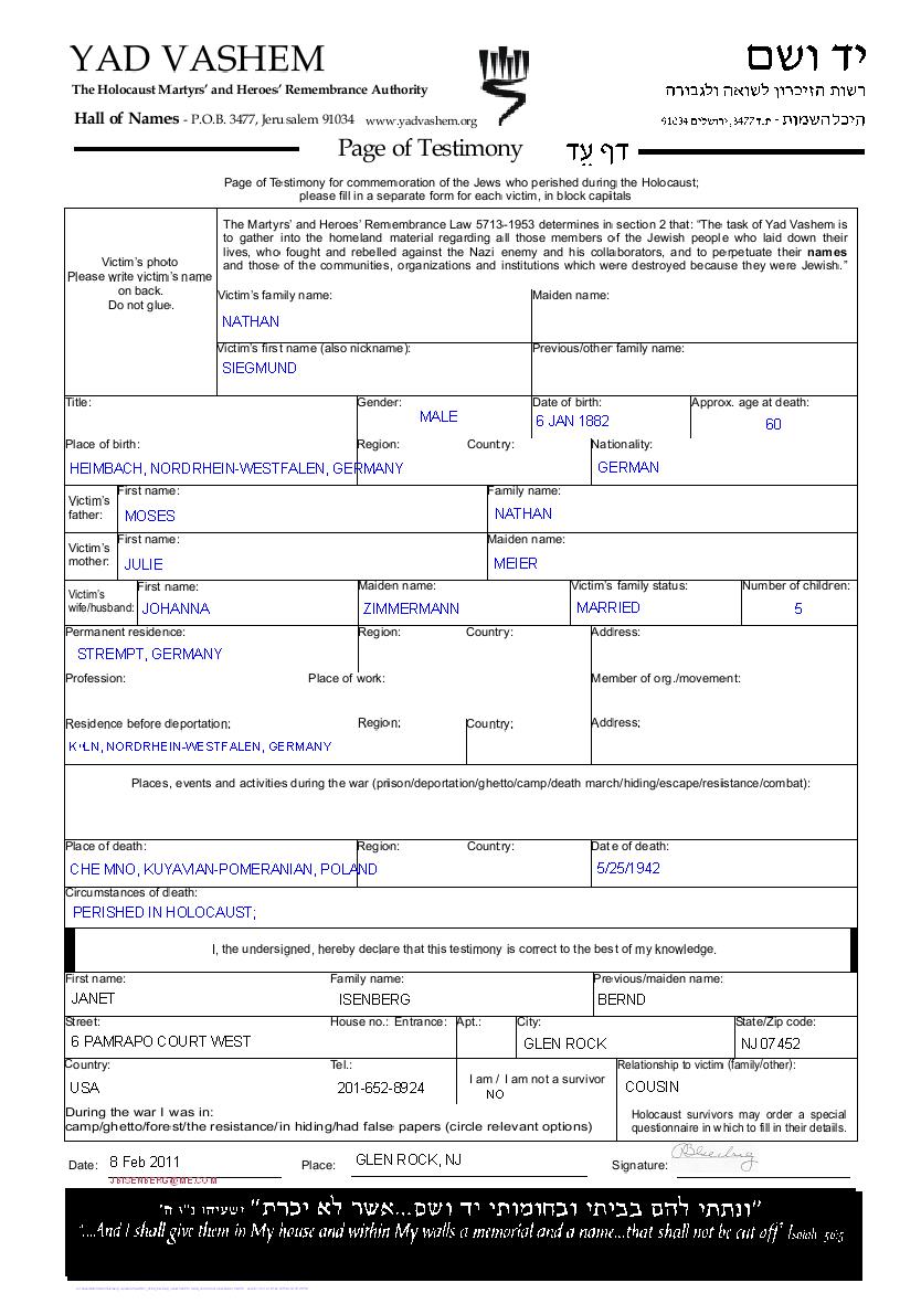 Nathan Siegmund 1882 Strempt, Germany Page of Testimony (digital)