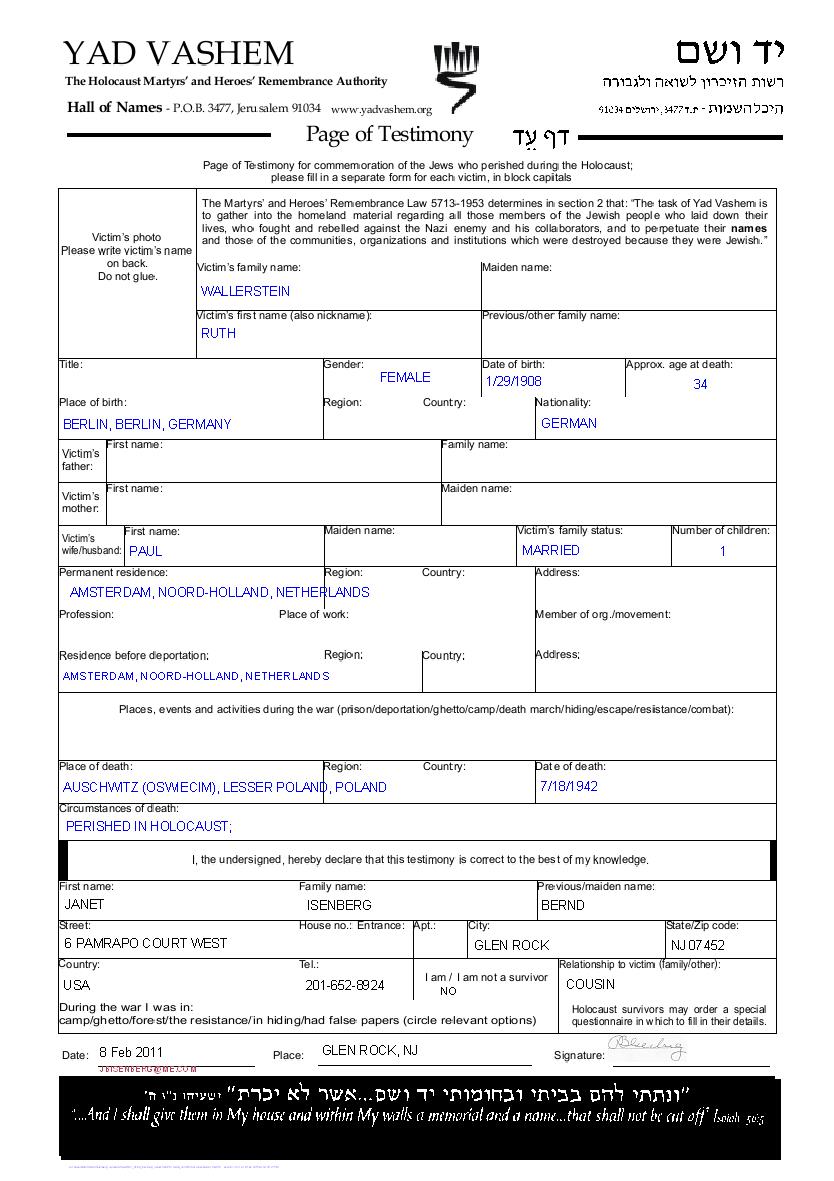 Ruth Wallerstein was born in Berlin, Germany, 1908. She was married to Paul. Prior to WWII she lived in Amsterdam, The Netherlands. During the war she was in Amsterdam, The Netherlands. Ruth was murdered in the Shoah. Place of death: Auschwitz, Poland, 18/07/1942.