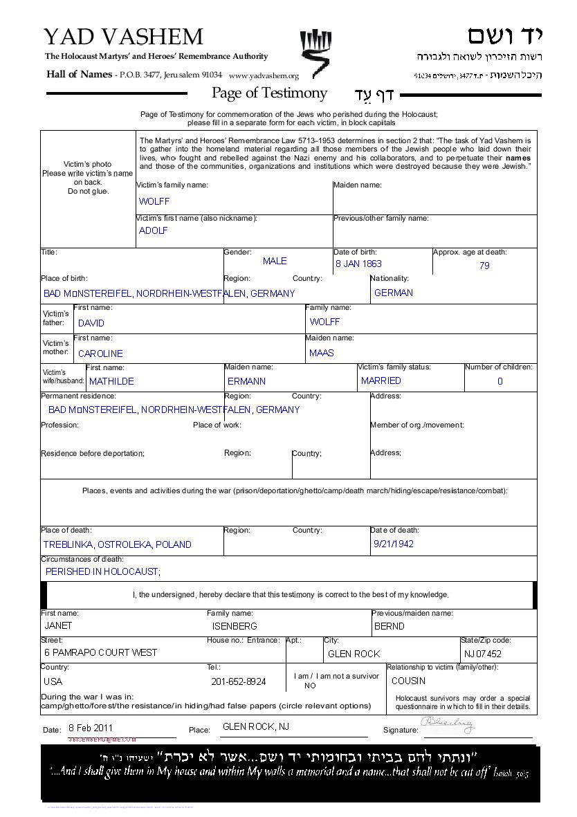 Adolf Wolff was born in Bad Muenstereifel, Germany, 1863 to David and Caroline nee Maas. He was married to Mathilde nee Ermann. Prior to WWII he lived in Bad Muenstereifel, Germany. Adolf was murdered in the Shoah. Place of death: Treblinka, Poland, 21/09/1942.