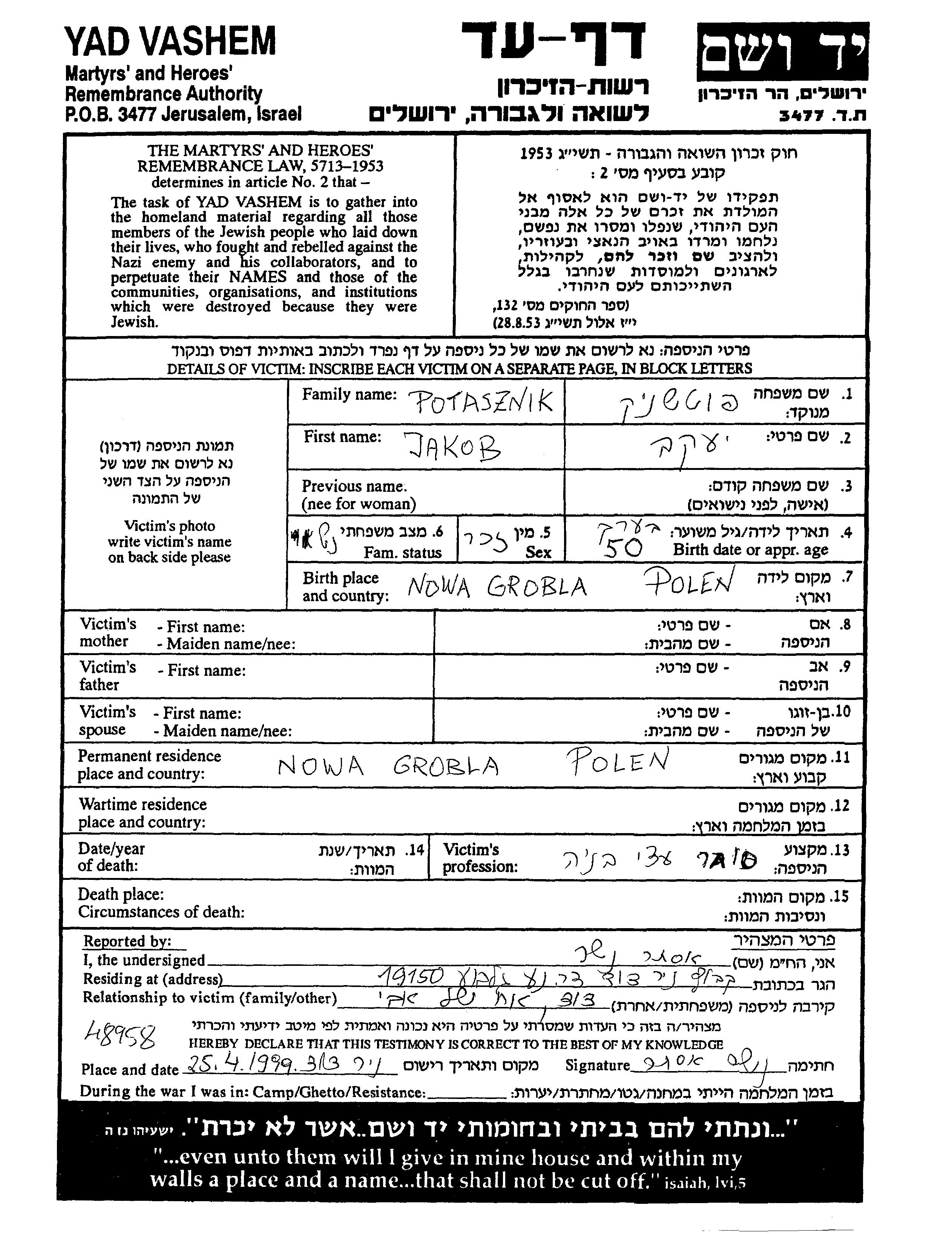Potasznik Jakob Nowa Grobla, Poland Page of Testimony