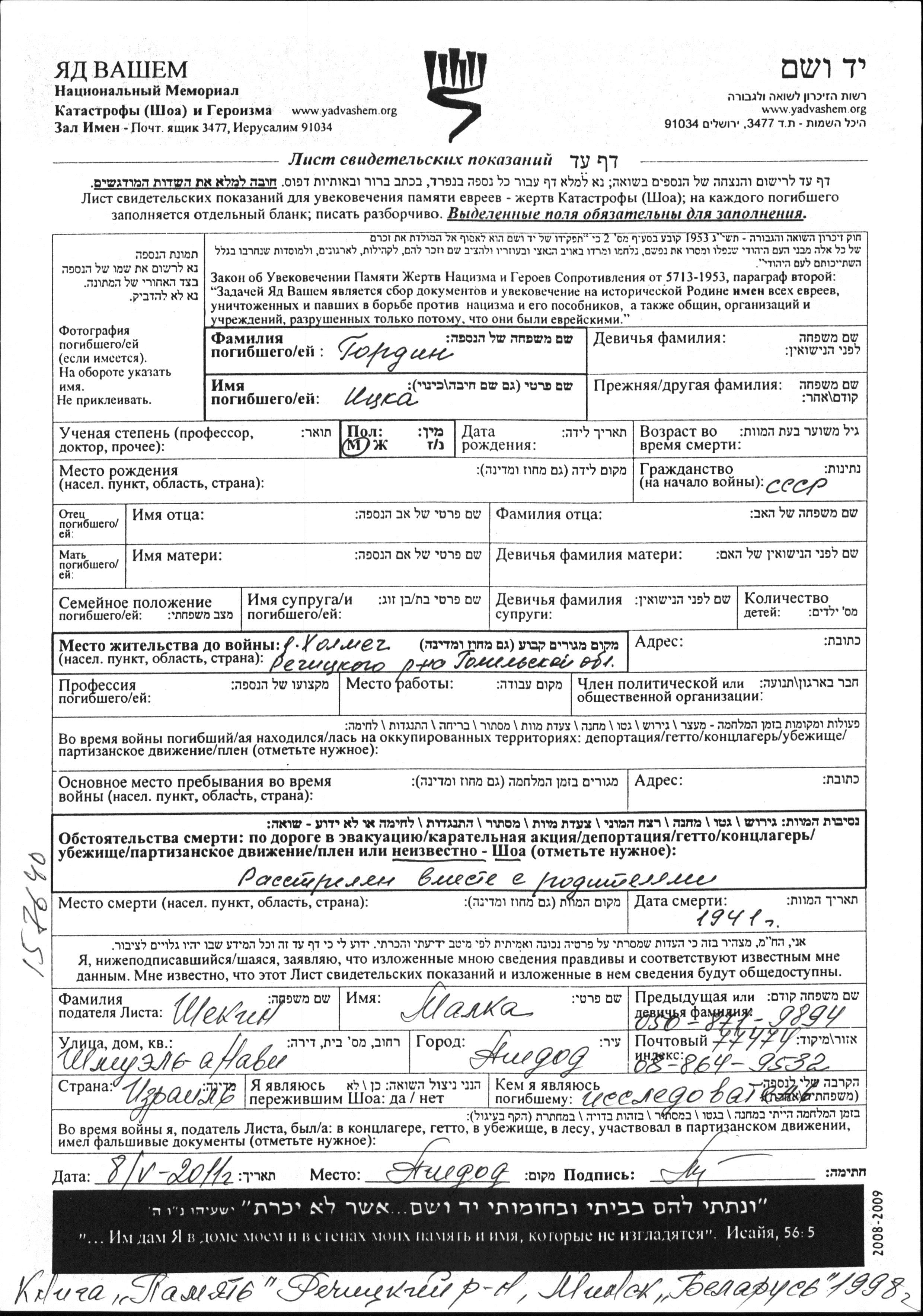 Gordin Itzka Kholmech, Belorussia (USSR) Page of Testimony