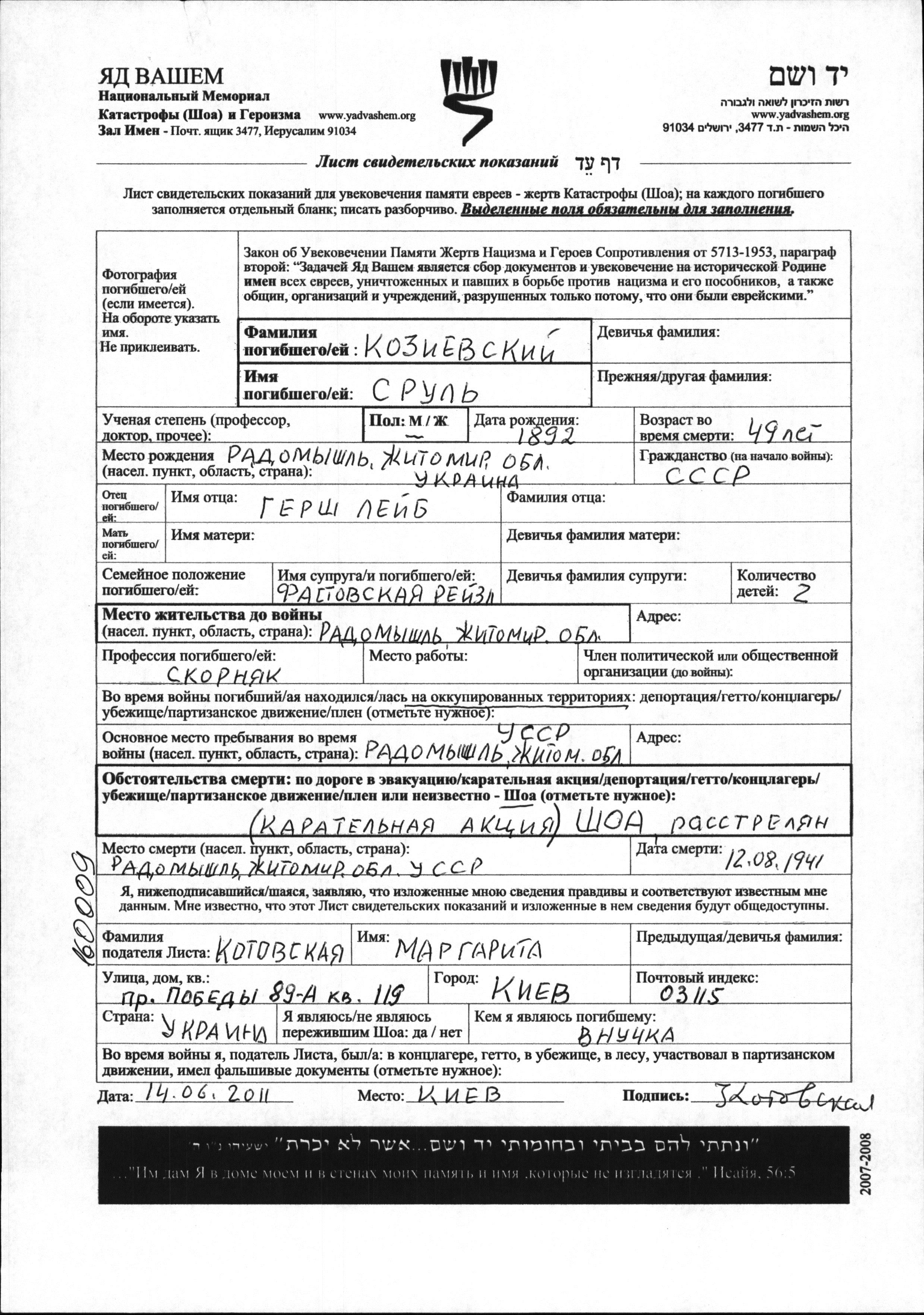Srul Kozievski was born in Radomyshl, Ukraine (USSR), 1892 to Gersh Leib. He was a furrier. Prior to WWII he lived in Radomyshl, Ukraine (USSR). During the war he was in Radomyshl, Ukraine (USSR). Srul was murdered in the Shoah. Place of death: Radomyshl, Ukraine (USSR), 12/08/1941.