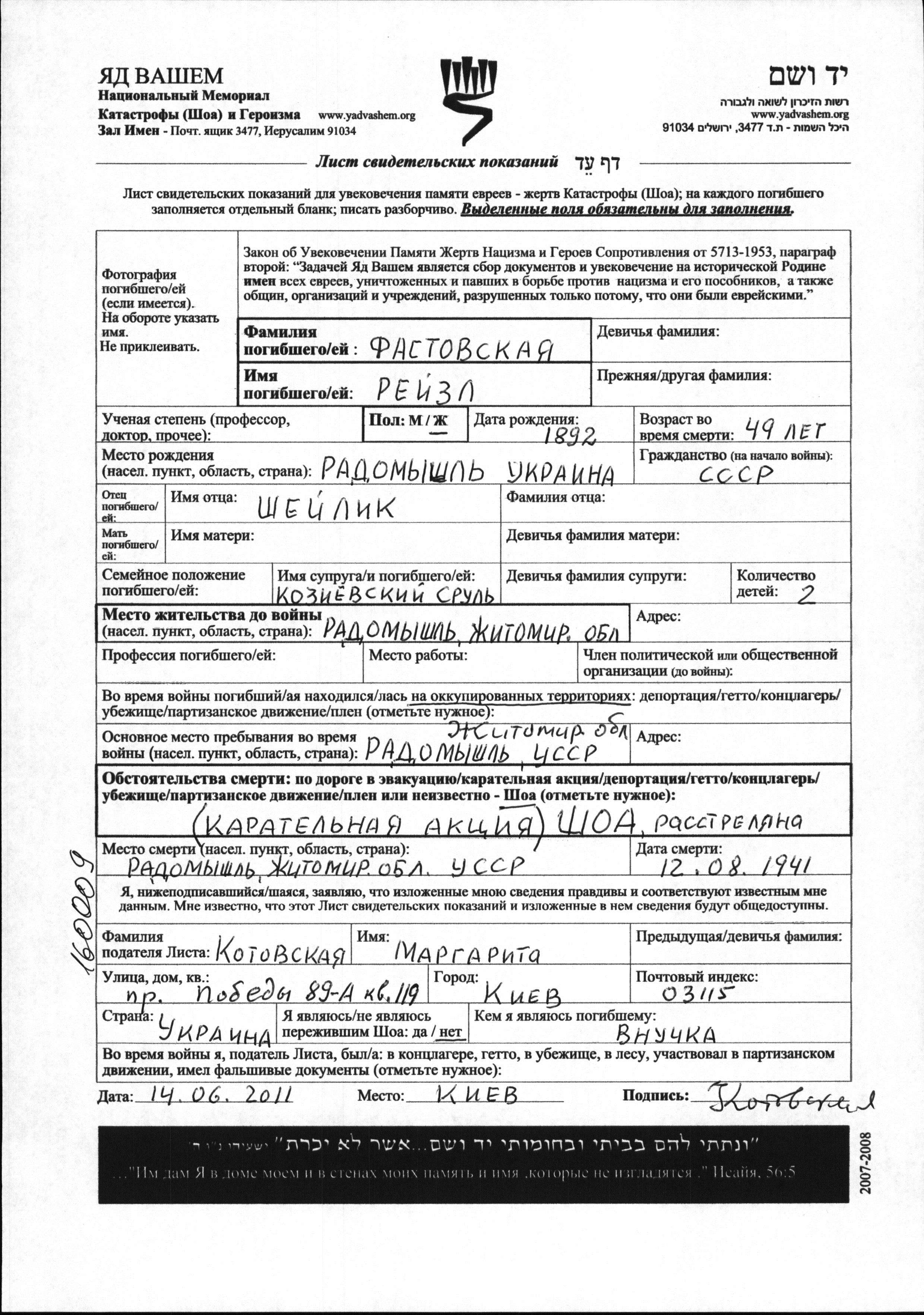 Fastovskaya Reyzl 1892 Radomyshl, Ukraine (USSR) Page of Testimony