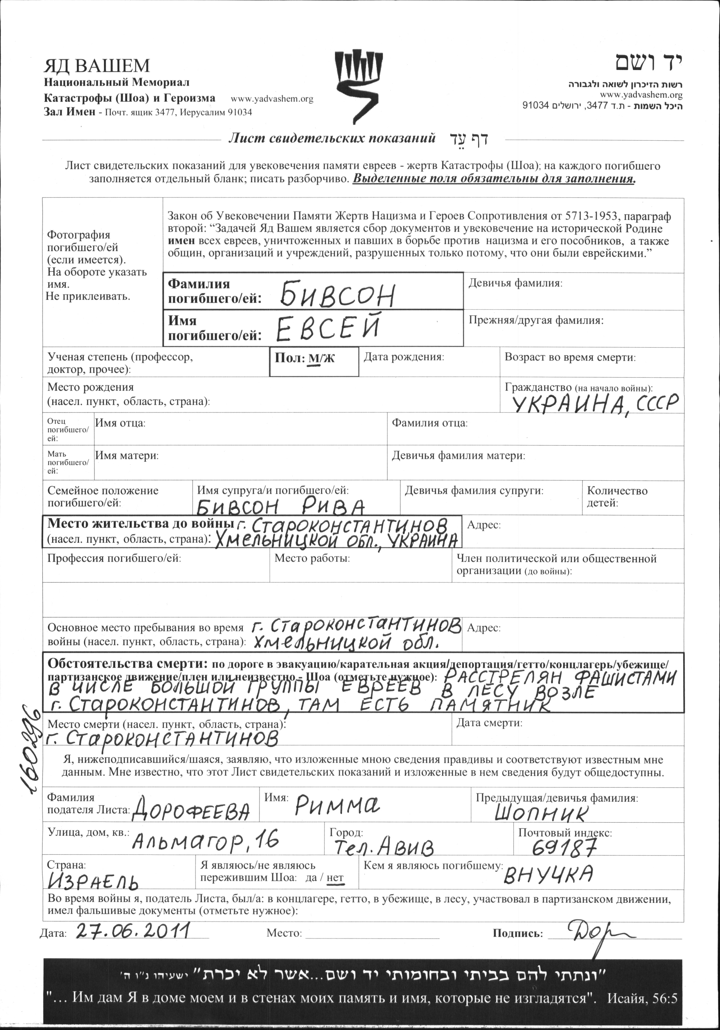 Bivson Yevsey Starokonstantinov, Ukraine (USSR) Page of Testimony