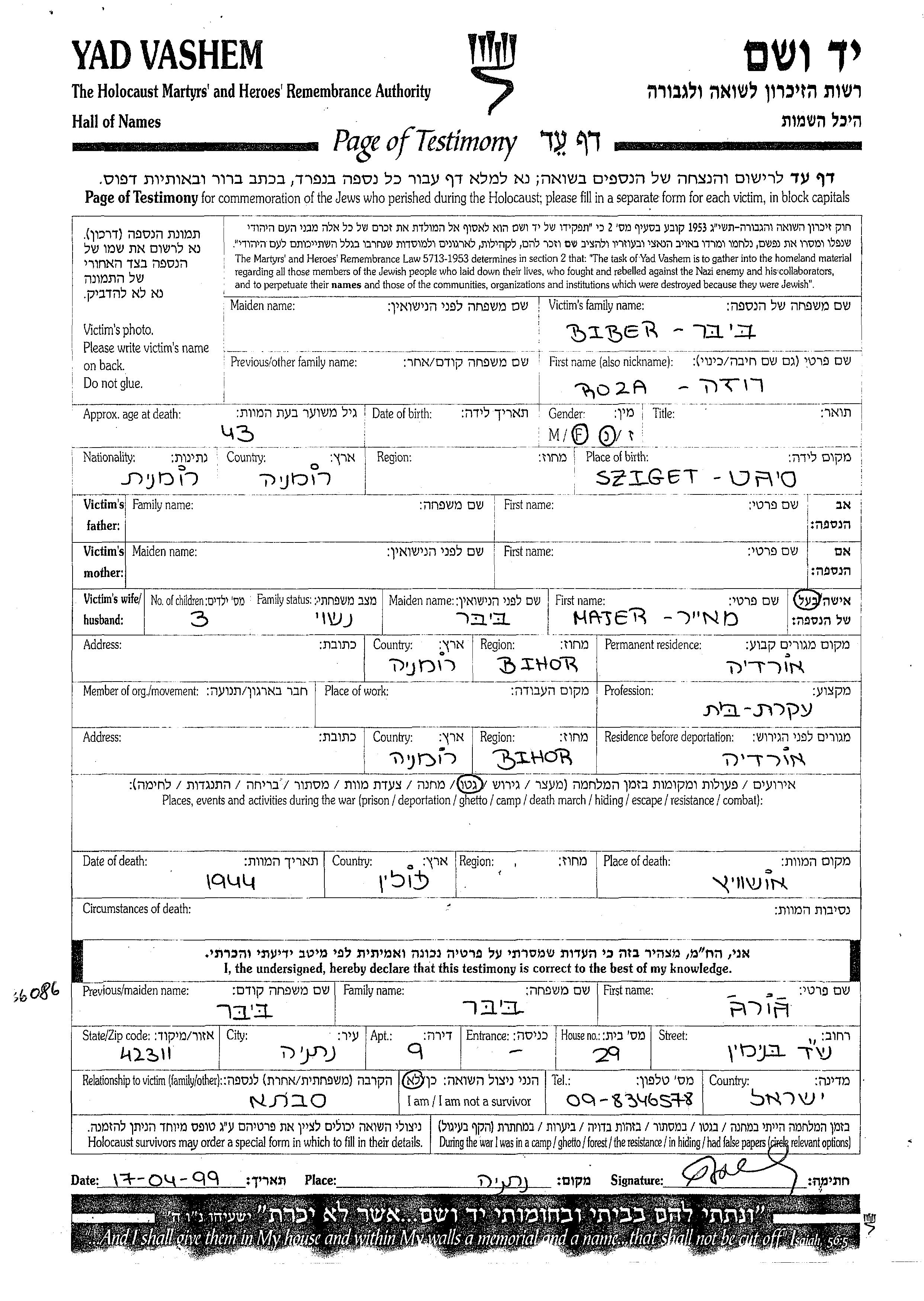 Roza Biber was born in Sziget, Romania. She was a housewife and married to Majer nee Biber. Prior to WWII she lived in Oradea, Romania. During the war she was in Oradea, Romania. Roza was murdered in the Shoah. Place of death: Auschwitz, Poland, 1944.