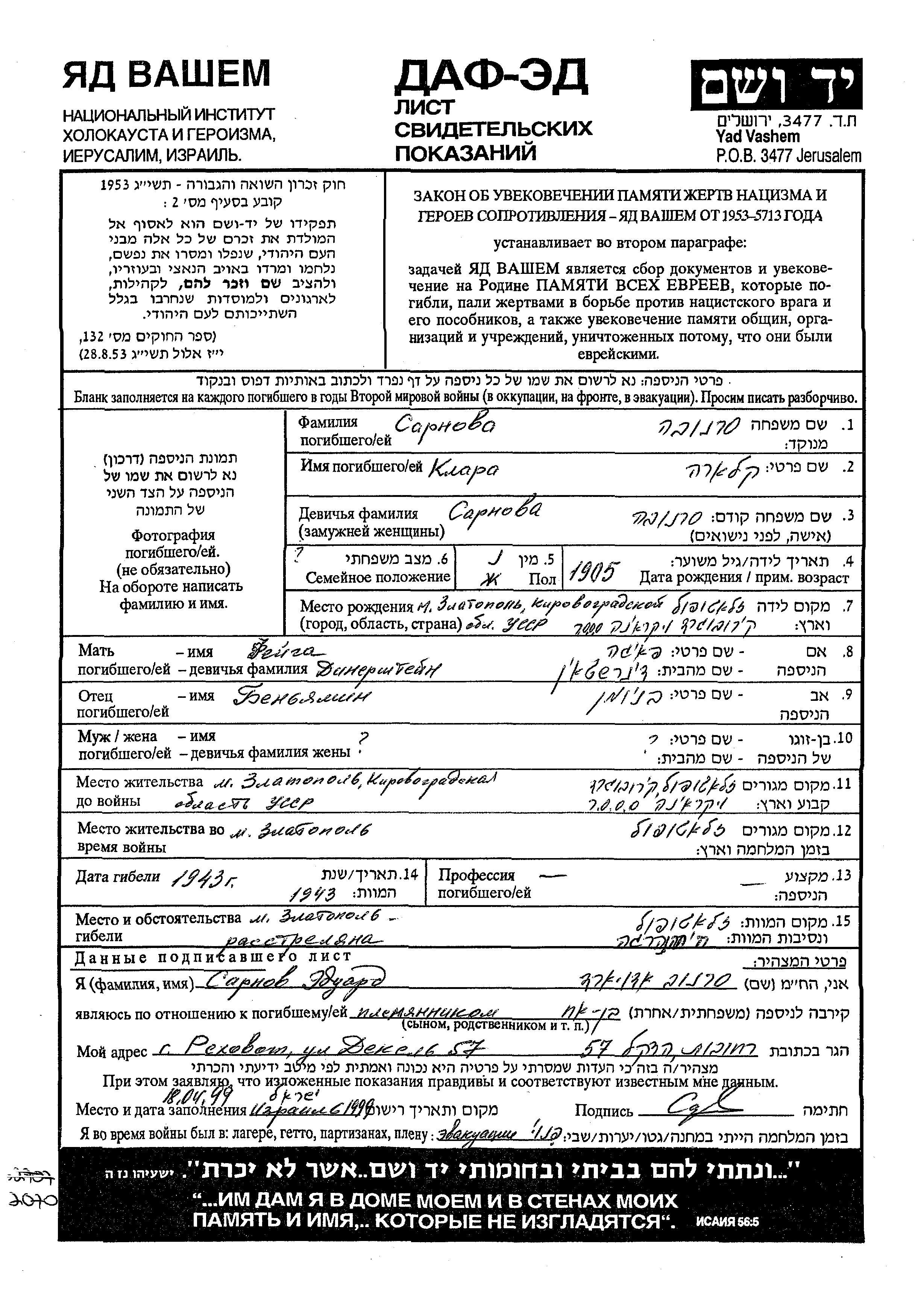 Sarnov Klara 1905 Zlatopol, Ukraine (USSR) Page of Testimony