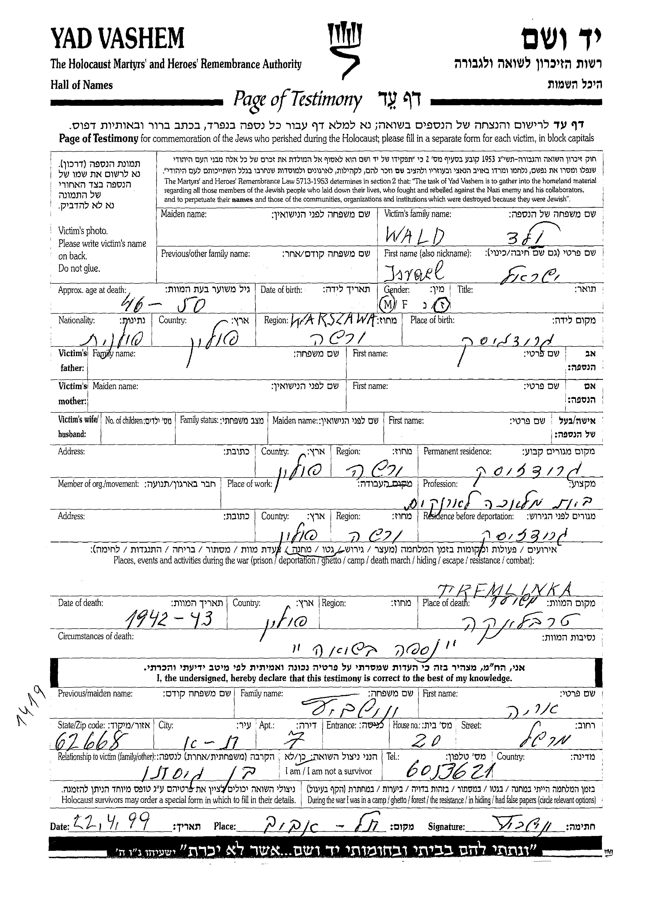 Israel Wald was born in Grodzisk Mazowiecki, Poland. Prior to WWII he lived in Grodzisk Mazowiecki, Poland. During the war he was in Grodzisk Mazowiecki, Poland. Israel was murdered in the Shoah. Place of death: Treblinka, Poland, 1942.