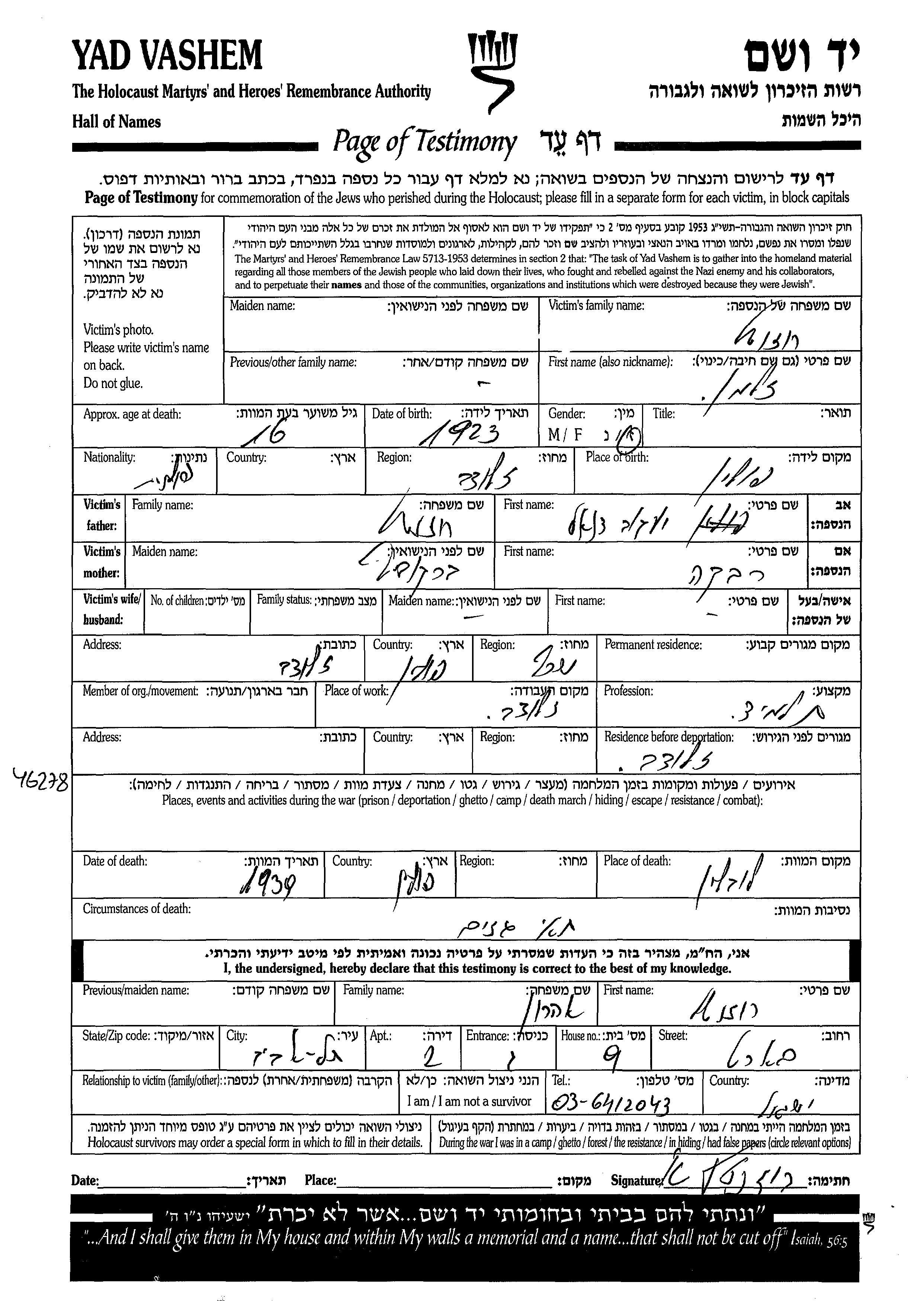 Yad Vashem - Pages of Testimony Names Memorial Collection