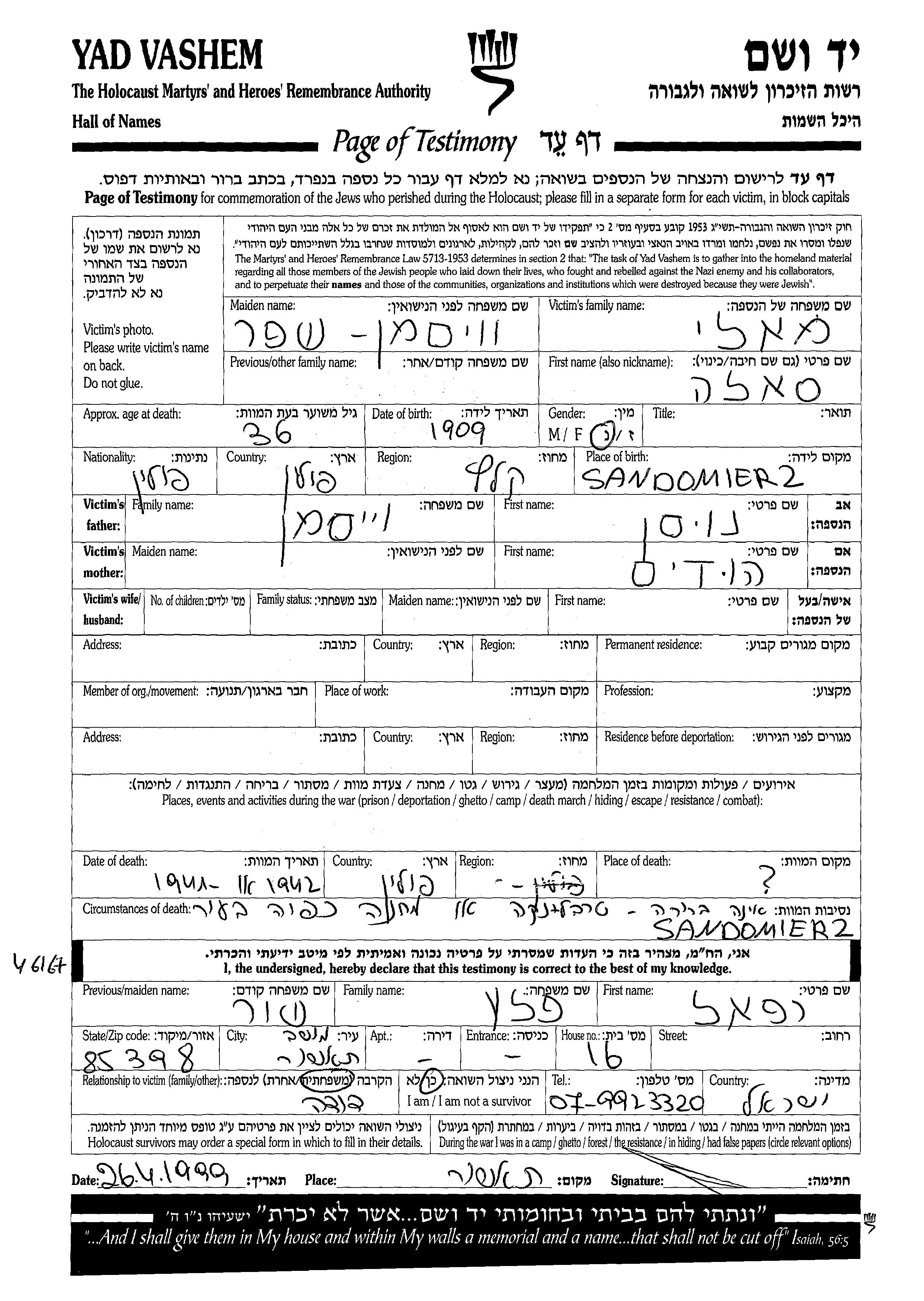 Maly Shefer Sala 1909 unstated place, Page of Testimony