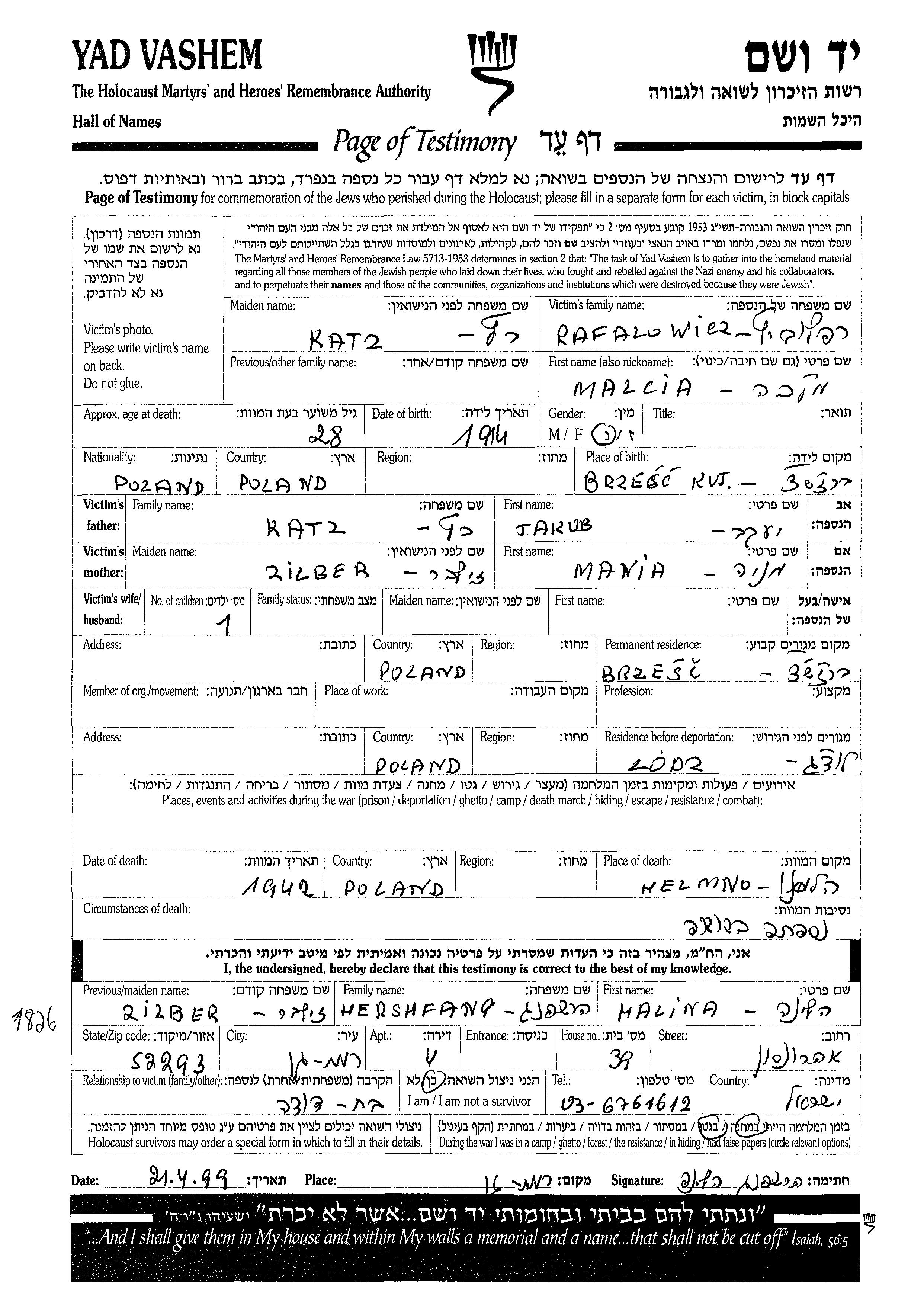 Malcia Rafalowicz nee Katz was born in Brzesc Kujawski, Poland, 1914 to Jakub and Mania. Prior to WWII she lived in Brzesc Kujawski, Poland. During the war she was in Lodz, Poland. Malcia was murdered in the Shoah. Place of death: Chelmno, Poland, 1942.