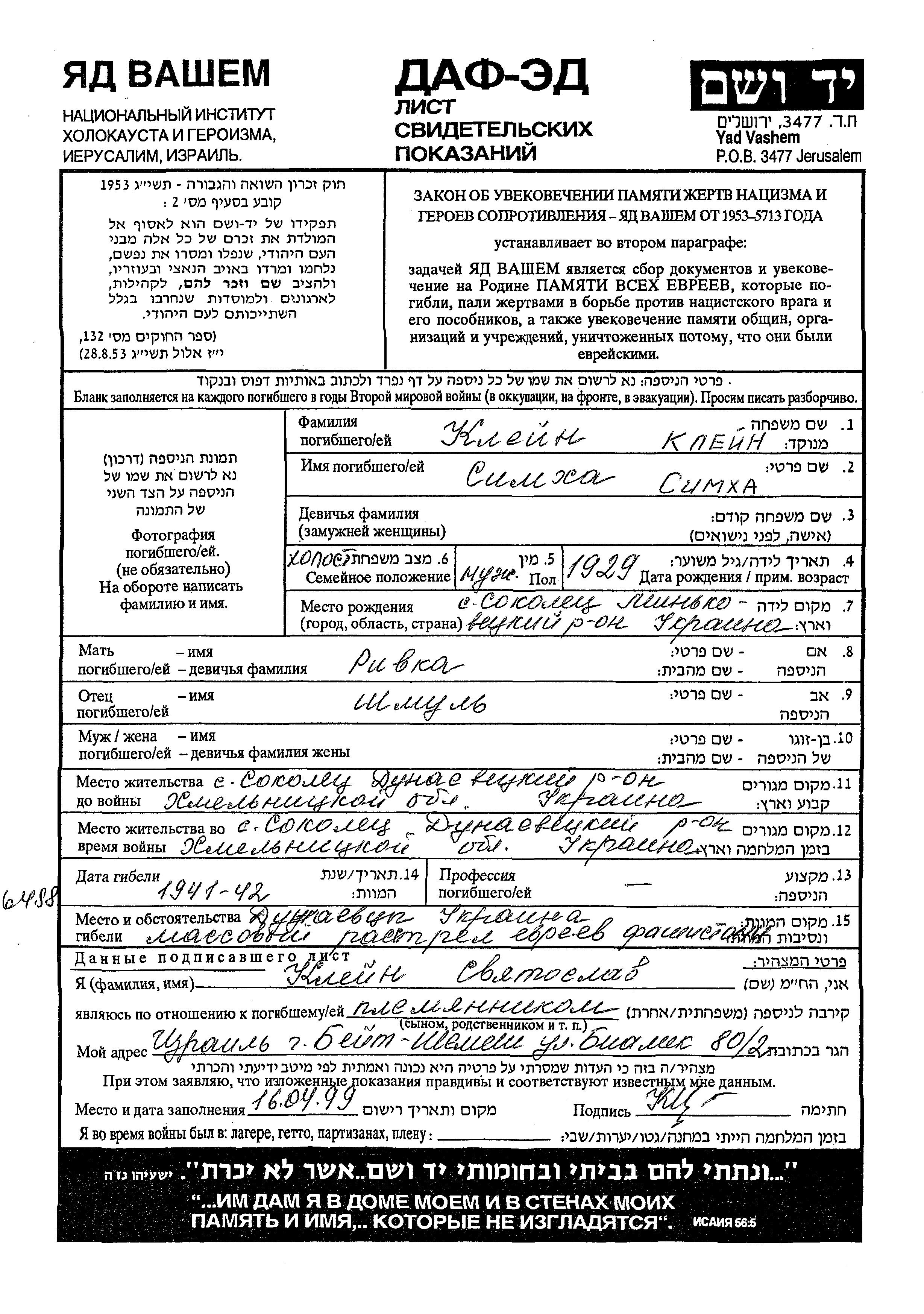 Simkha Klein was born in Sokolets, Ukraine (USSR), 1929 to Shmul and Rivka. He was single. Prior to WWII he lived in Sokolets, Ukraine (USSR). During the war he was in Sokolets, Ukraine (USSR). Simkha was murdered in the Shoah. Place of death: Dunayevtsy, Ukraine (USSR), 1941.