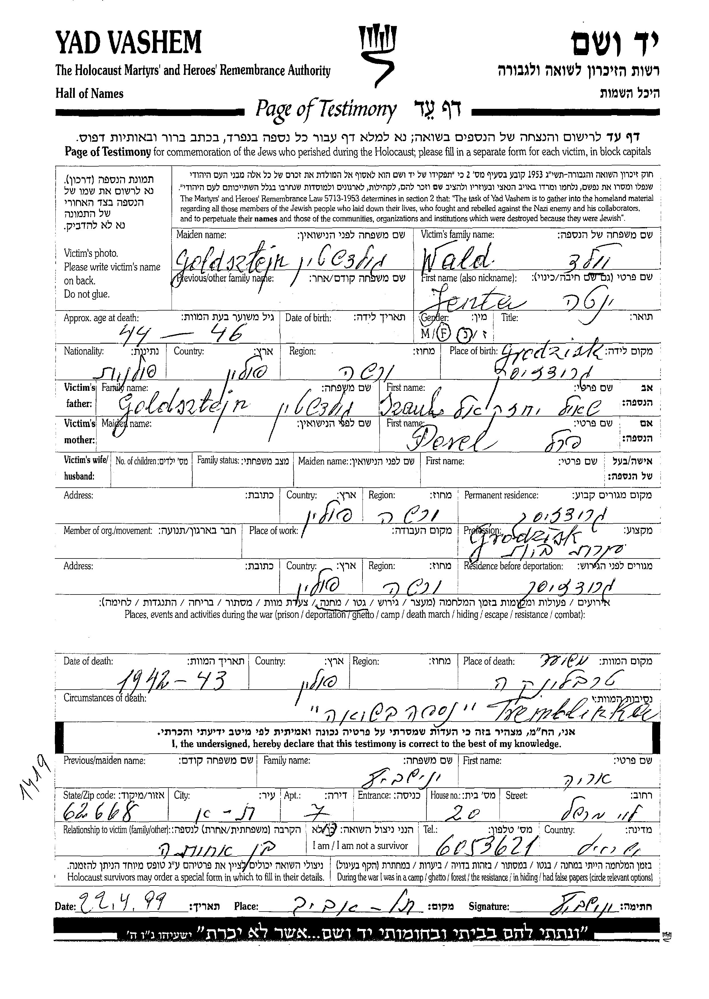 Jenta Wald nee Goldsztejn was born in Grodzisk Mazowiecki, Poland to Szaul Yekhezkel and Perel. She was a housewife. Prior to WWII she lived in Grodzisk Mazowiecki, Poland. During the war she was in Grodzisk Mazowiecki, Poland. Jenta was murdered in the Shoah. Place of death: Treblinka, Poland, 1942.