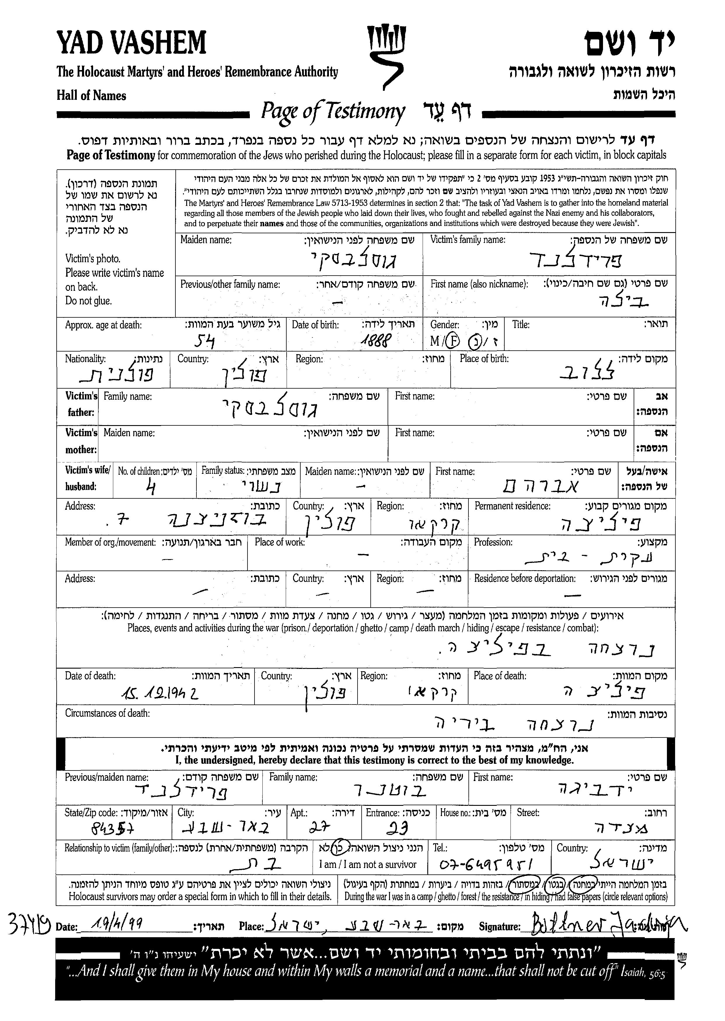 Bila Fridland nee Guselbski was born in Lelow, Poland, 1888. She was a housewife and married to Avraham. Prior to WWII she lived in Pilica, Poland. Bila was murdered in the Shoah. Place of death: Pilica, Poland, 15/12/1942.