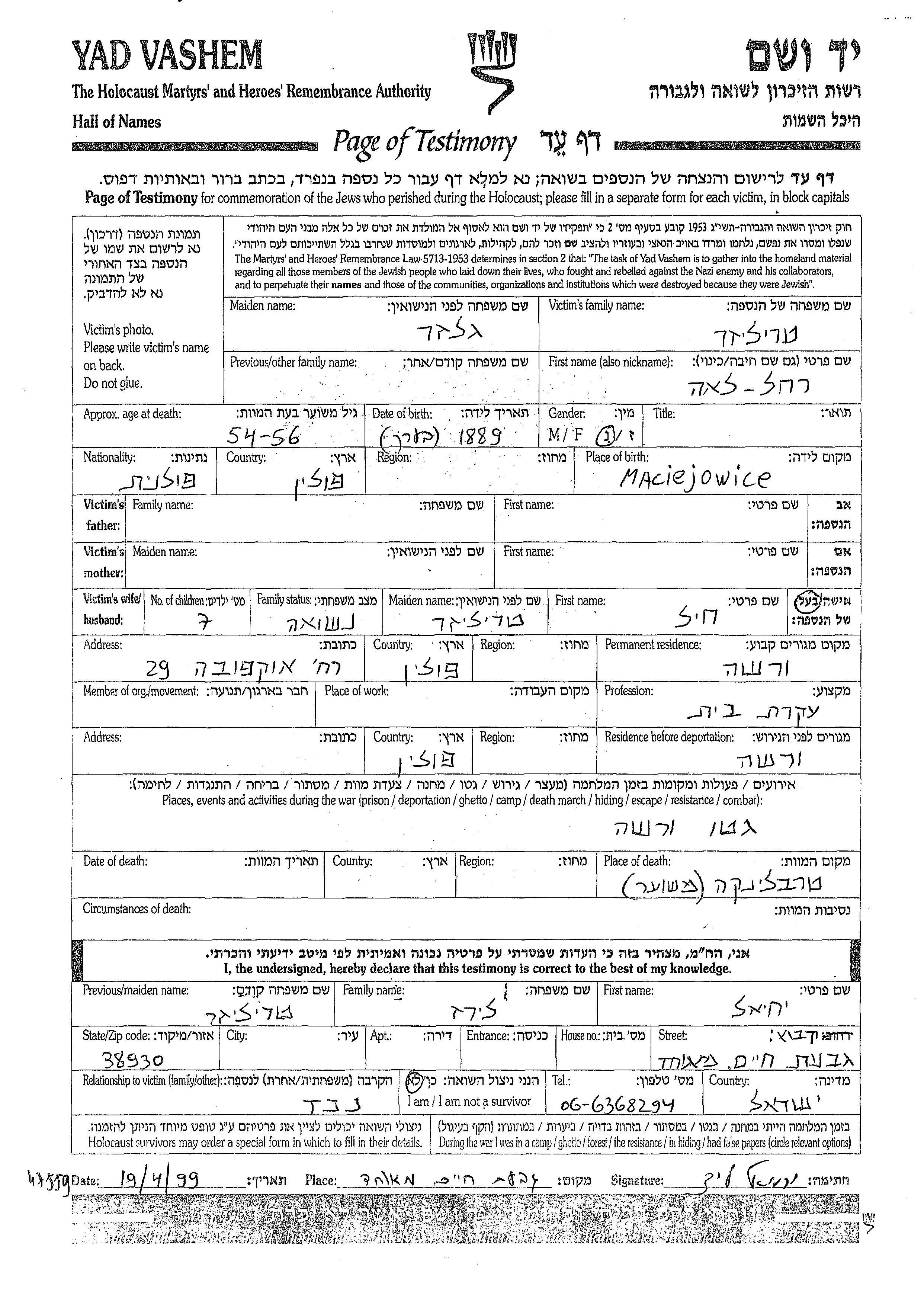 Rakhel Lea Treliser nee Glazer was born in Maciejowice, Poland, 1889. She was a housewife and married to Khil. Prior to WWII she lived in Warszawa, Poland. During the war she was in Warszawa, Poland. Rakhel Lea was murdered in the Shoah. Place of death: Warszawa, Poland.