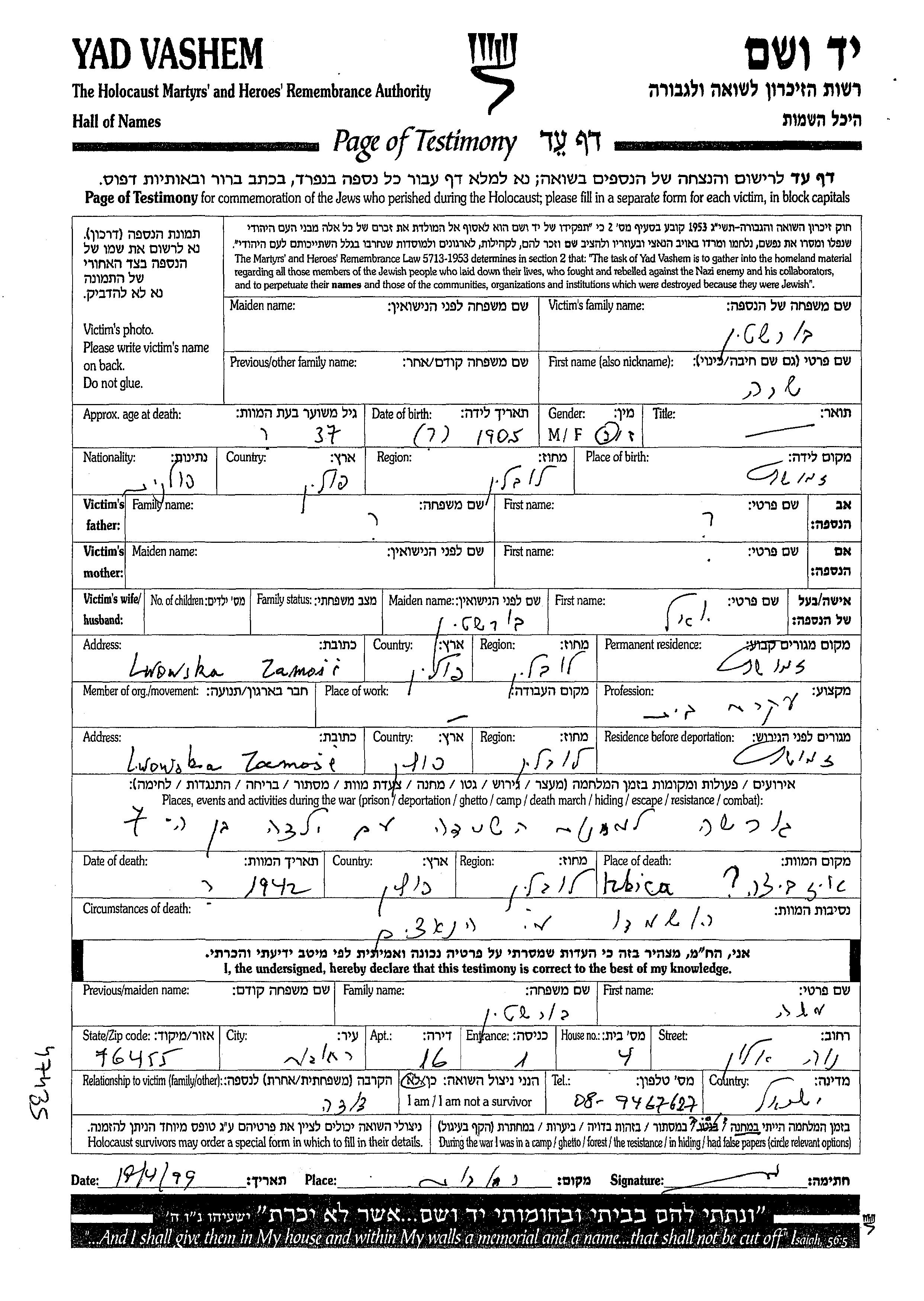 Sara Burshtin was born in Zmudz, Poland, 1905. She was a housewife and married to Yoel. Prior to WWII she lived in Zmudz, Poland. During the war she was in Zmudz, Poland. Sara was murdered in the Shoah. Place of death: Izbica Lubelski, Poland, 1942.